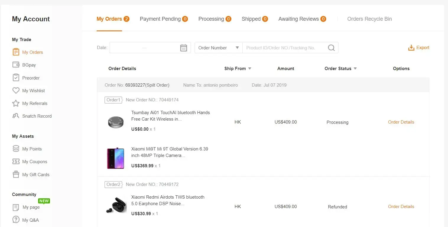 On July 7th of 2019, i placed an order on the Banggood website. The payment was processed and the money taken from my bank account, and the Expected Shipping date was now 2019-07-15 17:17:20.