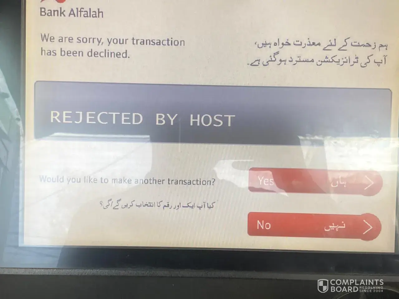 AoA Sir Ma Pachy 10 din sy Masalsal Alfah ki help line py cl kr ra ho or Sargodha Alfah branch khyam Chock ky chakar laga ra ho Mara ak problem ha Account ma Wo in sy hal nahi ho pa ra yah to ma apna account ksii or bank ma banwa lata ho yah kindly mara masla ko hal kea jae Ma ATM sy pasy nikalnay jao To Rejected By Host ka option a jata ha paymnet ni niklti agar Alfah App sy payment tranfer kro to Your Card has expired ka option a jata ha ma to tang a gya ho cls kr kr or ja ja kr brnach ma plzzz solve my problem otherwise i Change my Account in anyother Bank