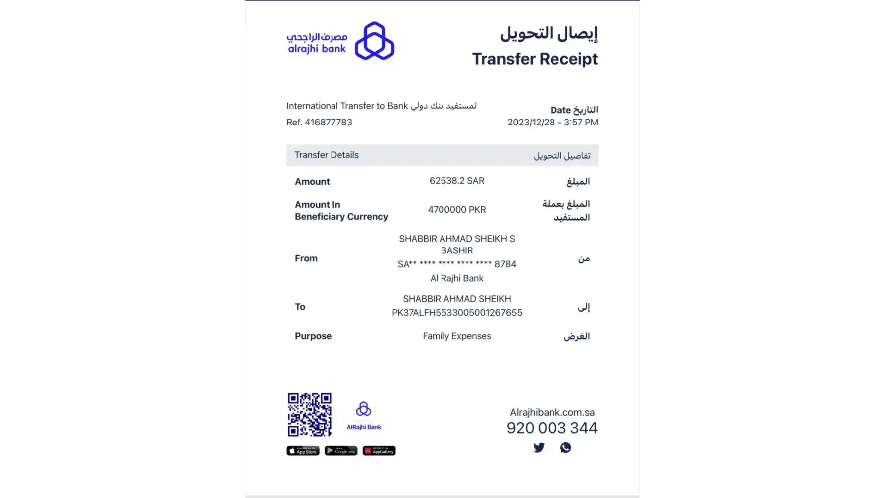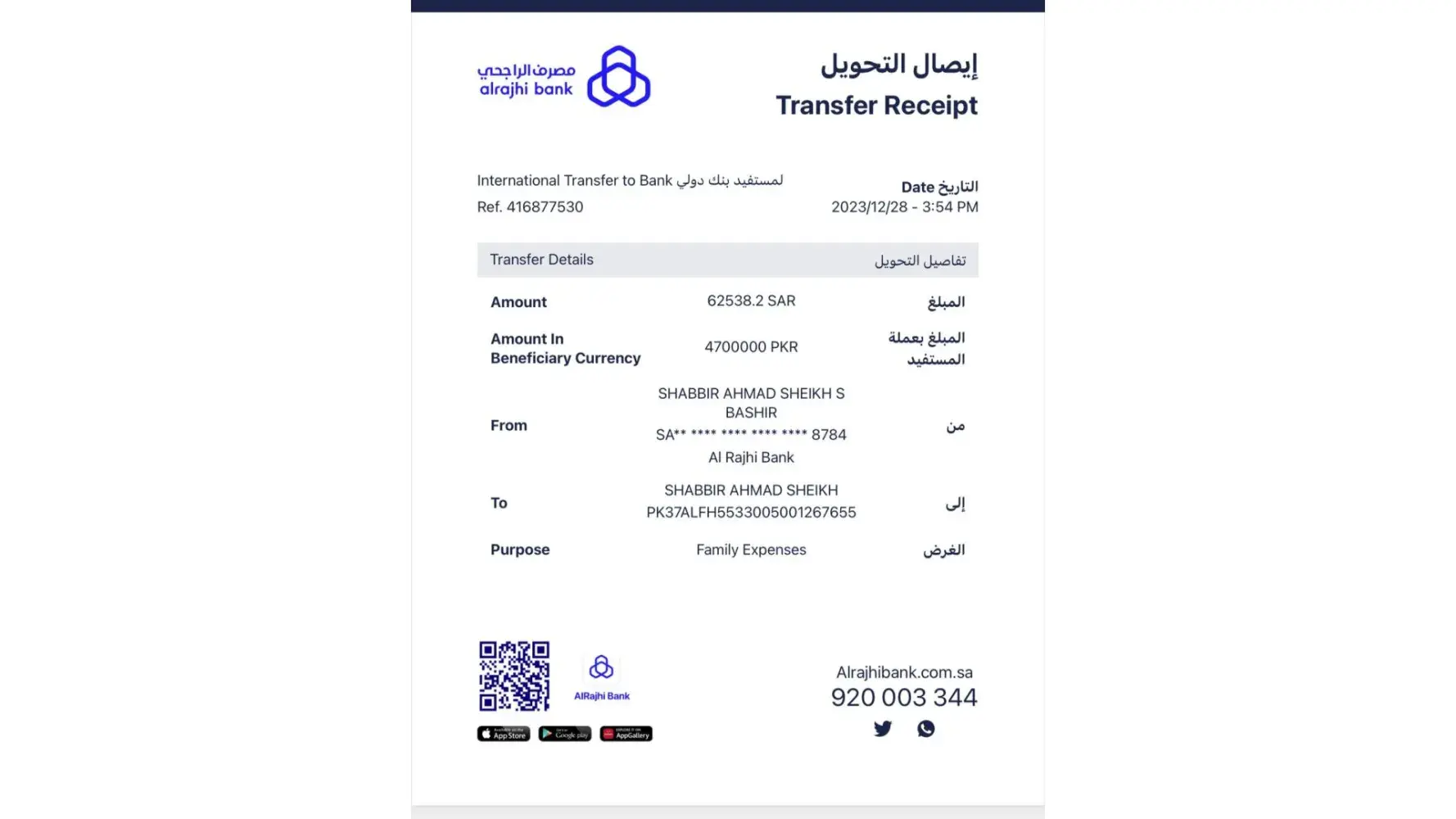 My Name : SHABBIR AHMAD SHEIKH,,,,,,,,,,,,,,I have roshan digital account with your bank,,,,,,,,,,,,CNIC - [protected],,,,,,,,,,,living in saudi arabia,,,,,,,,,,,,I had made two transactions of Rs 47 lacs AND 47 lacs on 28 dec ( both bank receipts attached ), 1st transaction at 3:54 pm and second at 3:57 pm ,,,,,,,,,,,,but yesterday on 29/Dec, i received only Rs 47 lacs ,,, second 47 lacs still not received yet in my RDA account ,,,,,,Please need your help ,,,,,,,,,,,,can you check please ,,,,,,thanks