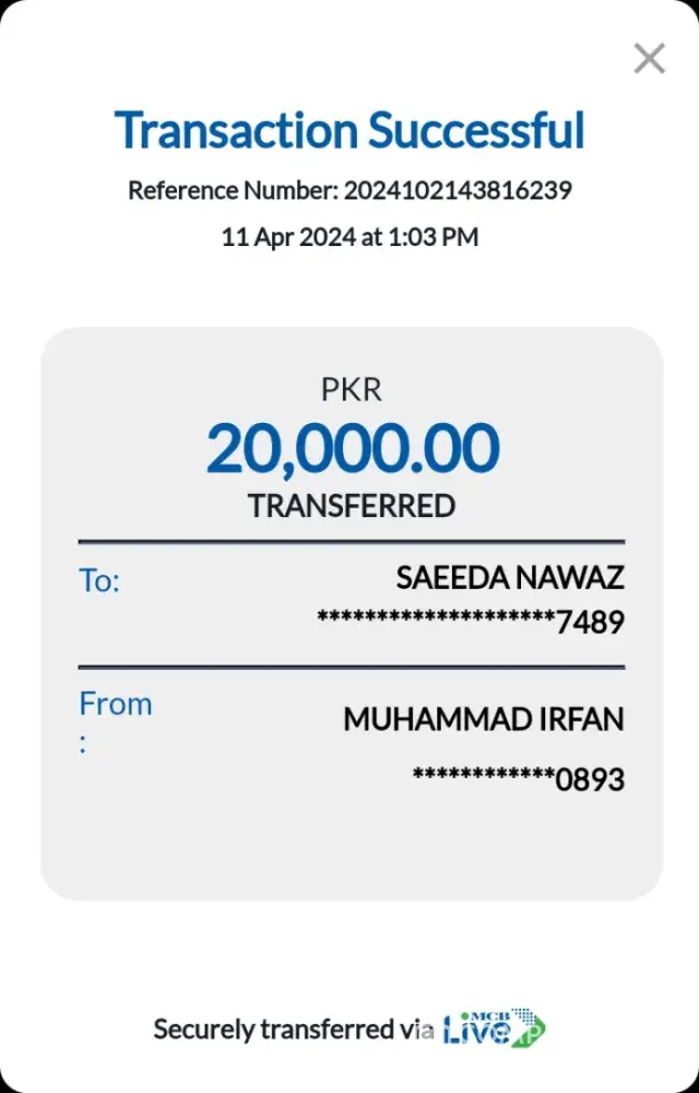 Claimed loss: Return my money .20000pkr recover from PK55ALFH0744001008847489 account holder saeda nawaz.