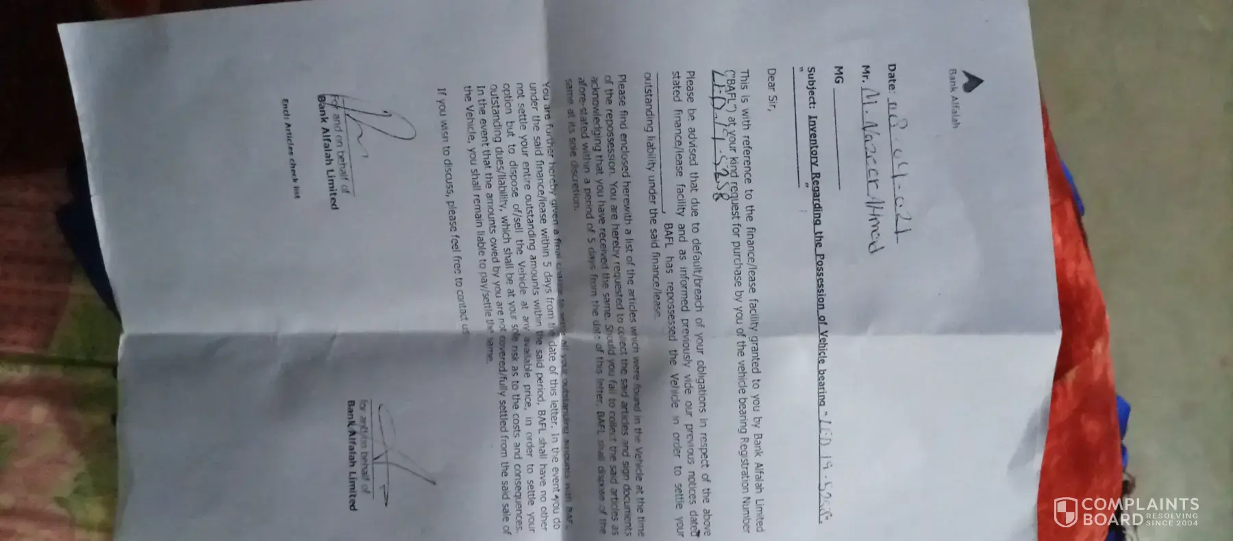 Bank Alfalah Complaint regarding not receiving a letter of Motorcycle