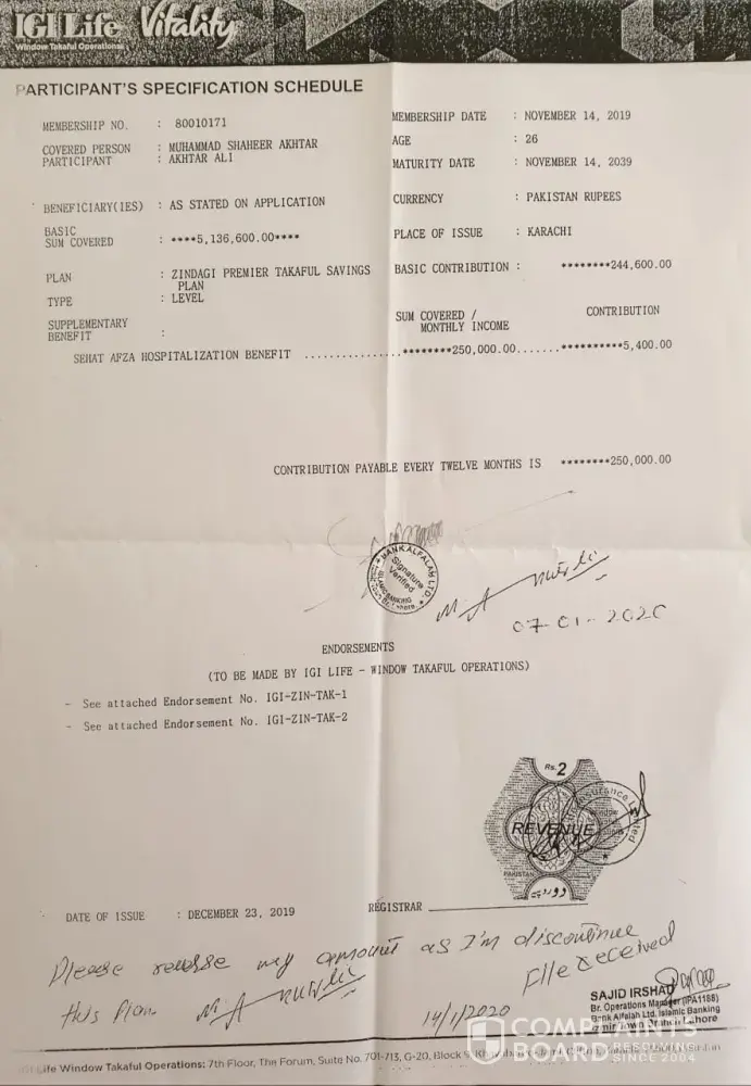 یہ لاءیف پلین آج سے تقریبا چار ماہ قبل بنک میں مجھے بتایا گیا اور کہا گیا کہ منظوری پلین کے بعد آپکو پندرہ دن تک اختیار ہوگا جاری رکھیں یا ختم کروا دیں 15 نومبر 2019 کو میرے اکاونٹ سے ڈھائی لاکھ روپے نکال لئے گئے ۔ میں نے پندرہ دن سے پہلے ہی پلین ختم کرنے کا لکھ کر دیا لیکن رقم آج تک میرے اکاونٹ میں جمع نہیں ہوئ میری رقم مع پرافٹ جمع جائے