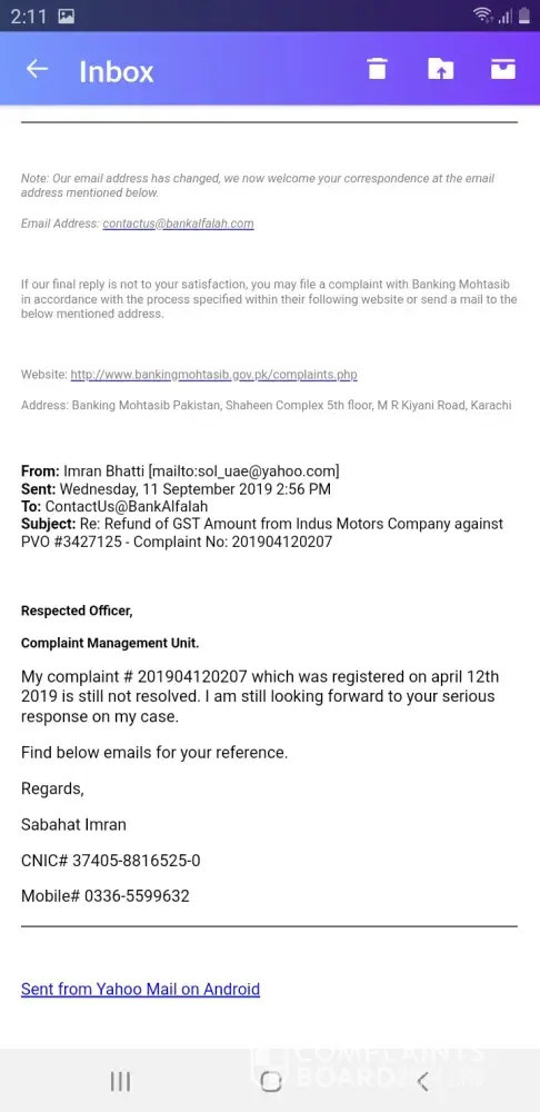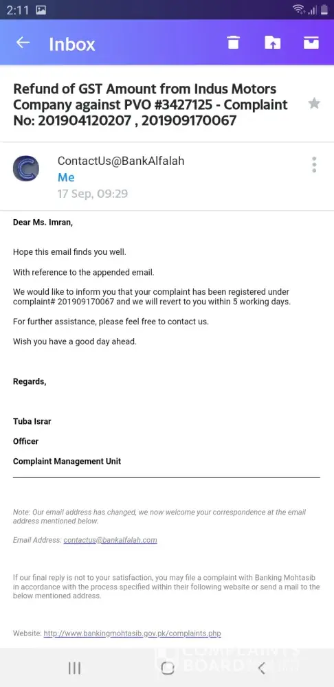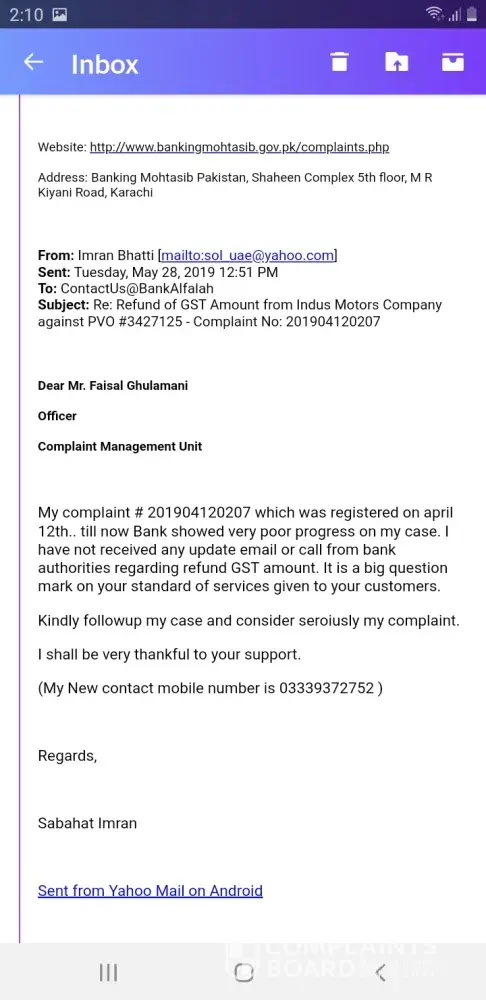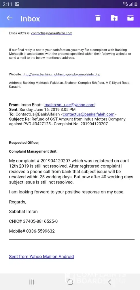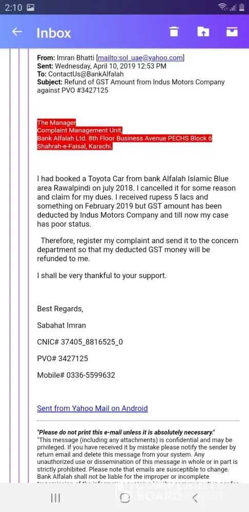 I had booked a Toyota Car from bank Alfalah Islamic Blue area Islamabad on july 2018. I have cancelled it for some reason and claimed for my dues. Bank Alfalah refund me some amount in Feb 2019 and said that GST amount has been deducted by Indus Motors Company will refund you later. I registered a complaint to claim my balanced dues on April 2019 but untill now Bank is showing very poor customer service on my case.