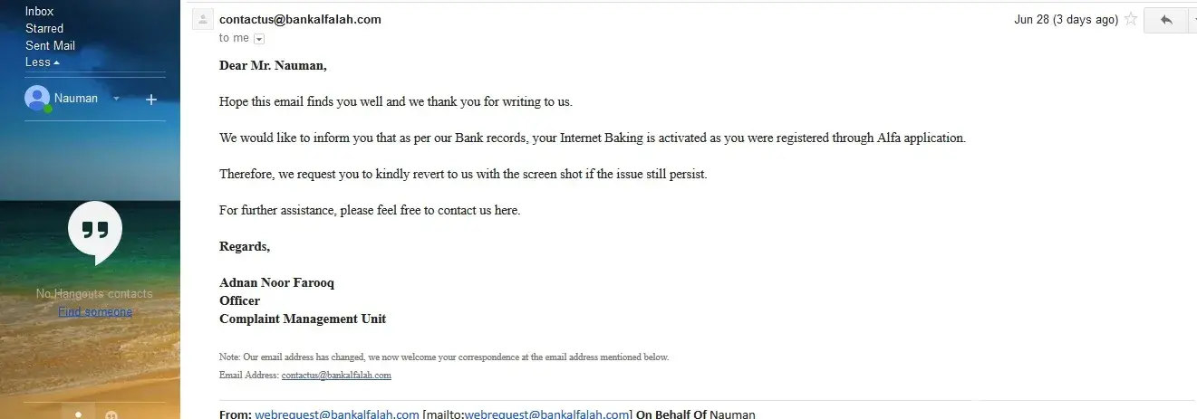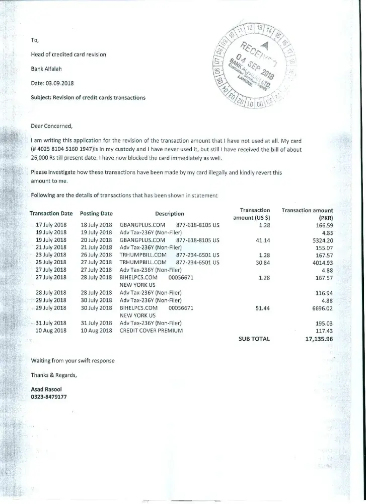 But i received bill from bank Alfah two days ago, that shows illegal on line transaction though my card, please investigate how these transactions have been made through my card illegally as card was in my custody. now i have blocked the card and have submitted a written application to the dispute resolution unit of Bank Alfalah.