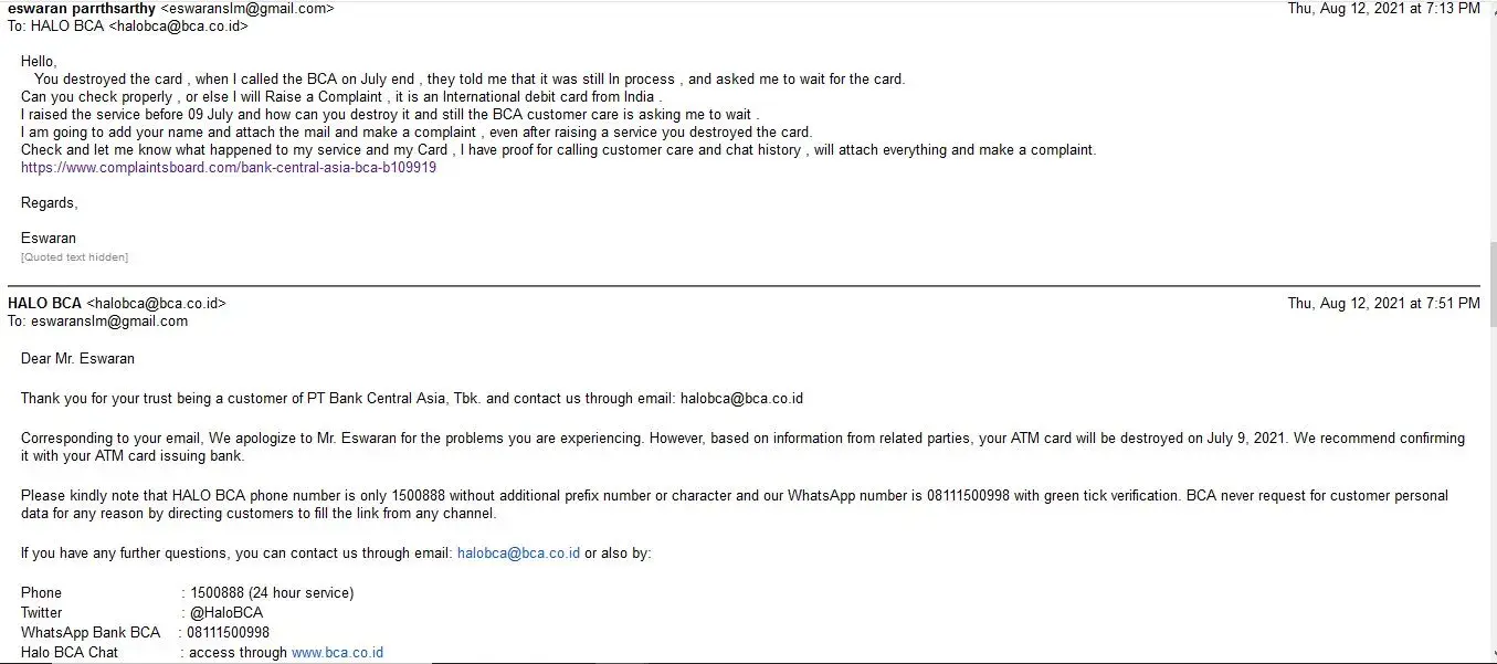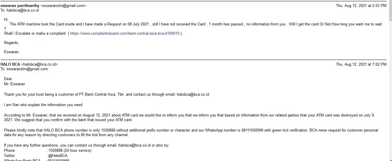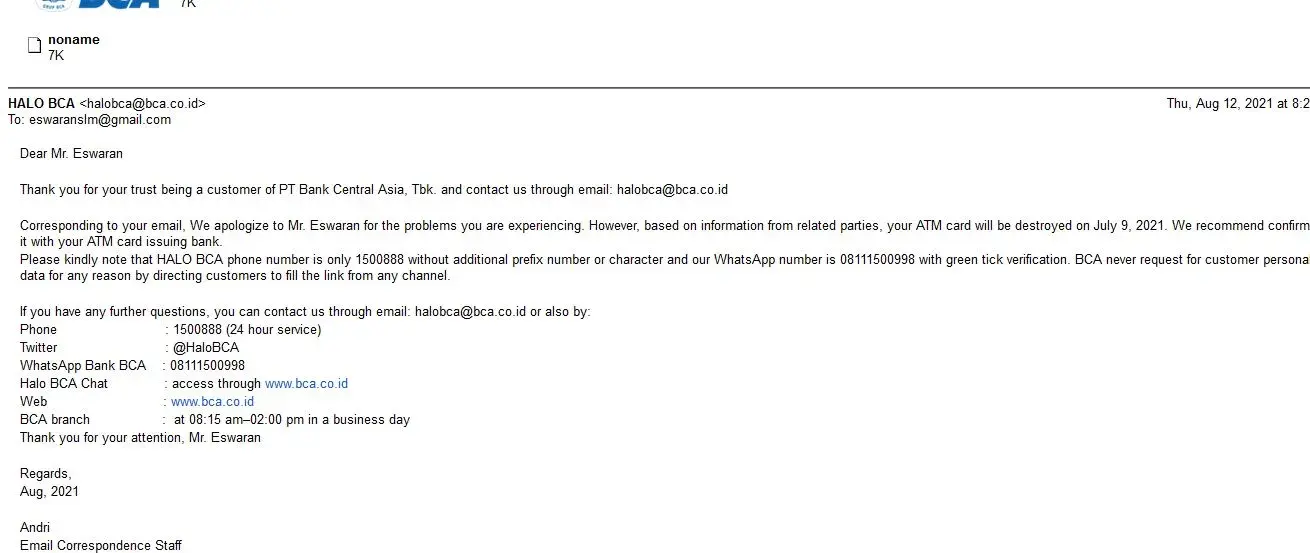 Very good Services by BCA customer care and BCA bank.