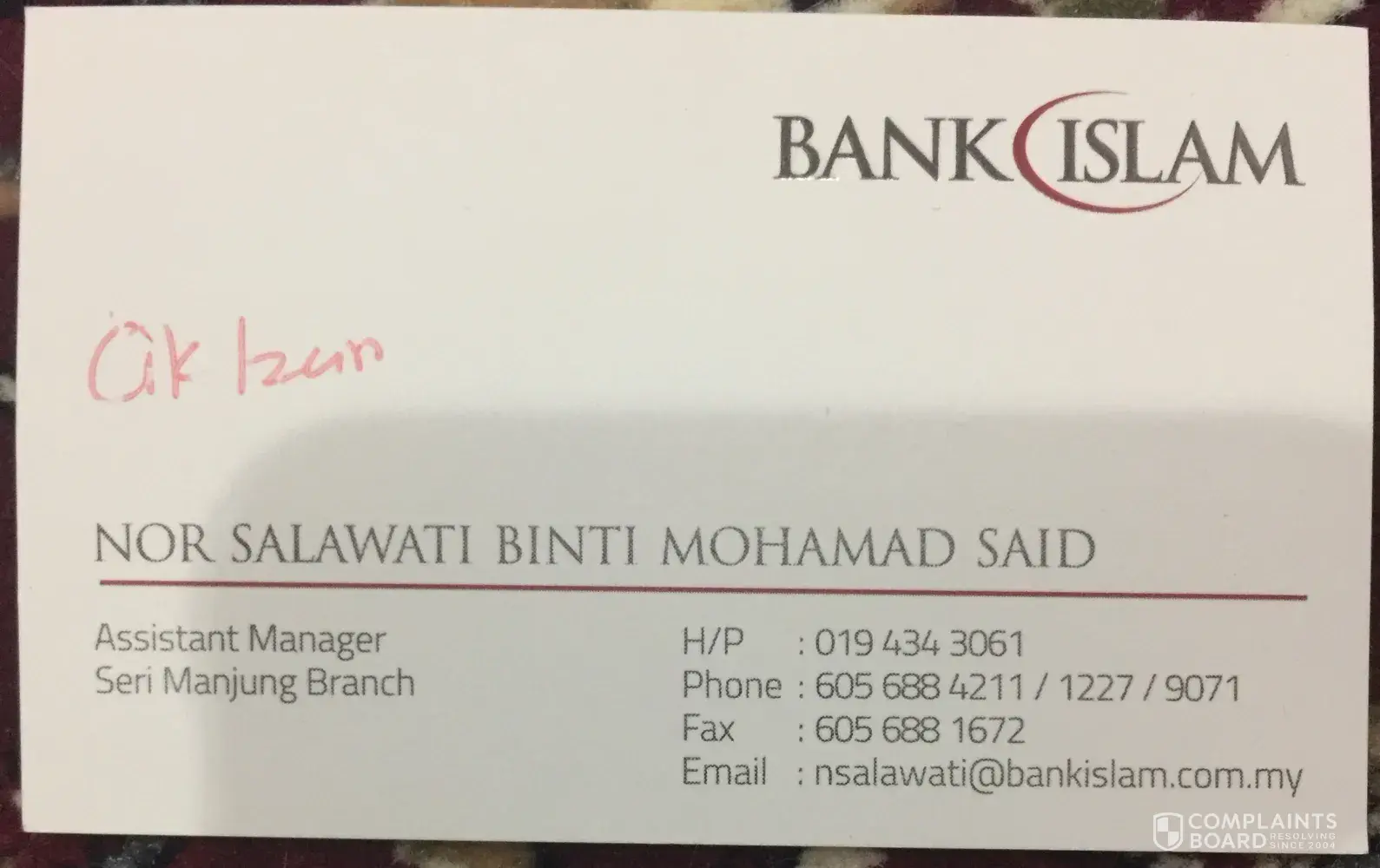 Saya Puan Maziah Mohd Ali mempunyai akaun home loan dengan Bank Islam.Pada 1 August 2018, saya ada bersama suami ke cawangan Bank Islam Seri Manjung Perak untuk pertanyaan berkenaan refinance home loan.Kami berjumpa dengan Personnel Pn Nor Salawati Mohamad Said (Assistant Manager Seri Manjung Branch) dan membuat pertanyaan berkenaan refinance.Beliau pada mula melihat rekod kami dikomputer dan yakin kami bole proceed dgn pemohonan.Cuma beliau agak mengeluh kerana pemohonan saya kali ini menggunakan akaun syarikat sebagai dokumen pendapatan.Tidak seperti sebelum ini saya gunakan slip gaji lebih mudah utk diproses mengikut kata personnel tersebut.Banyak proses & paper work kononnya.Beliau arahkn saya utk whatsapp gambar terkini rumah.Semua dokumen saya telah sediakn dan email kpd beliau pada hari berikutnya.Kebetulan hari yg sama saya ada juga submit permohonan refinance dgn Bank Rakyat.Selepas whatsapp saya menunggu hampir seminggu utk Pn Nor Salawati whatspp saya untuk feedback berkenaan pemohonan tetapi tiada apa whatsapp diterima sehingga saya terpaksa whatsapp & bertanya sendiri kepada beliau.Beliau memberi alasan sedang bercuti & balik bercuti akn semak dokumen.Sehingga lah pada Khamis 9 August beliau bertnya berkenaan income tax kemudian kembali senyap tiada jawapan atau invitation utk saya isi borang & sebagainya.Selasa 14 August 2018 saya mendapat maklumbalas dari Bank Rakyat refinance saya lulus & saya agak hairan kenapa sehingga itu Bank Islam tiada jawapan.Saya akhirnya whatspp Pn Salawati berkenaan status refinance saya & akhirnya baru beliau call saya & menyatakan pemohonan refinance saya gagal dengan alasan monthly income tidak layak untuk pemohonan refinance.