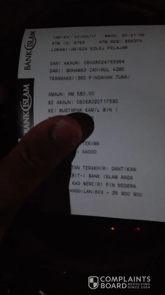 On 7 may 2017, I had done an error in transferring an amount of money, rm 580 to account of bank islam owned by mustapha kamil bin ismail [account no:[protected]] and I also provide the phone no: [protected] for the bank to contact him. Supposedly, I transfer those money to my university's bank account in order to pay for my studies. Hence, I seek for your convenience to refund those money because i'm a student and I need those money for my studies fee. Thank you.