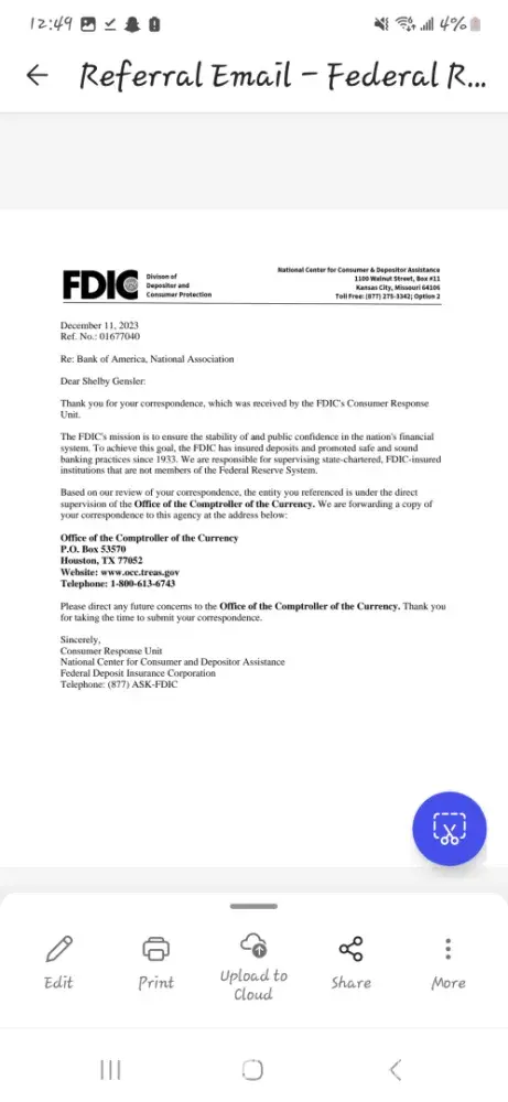 Shortly after that, I received a letter from BofA saying my credit card 'credit limit' was being reduced to $500.00 - I called them to re-explain EVERYTHING.