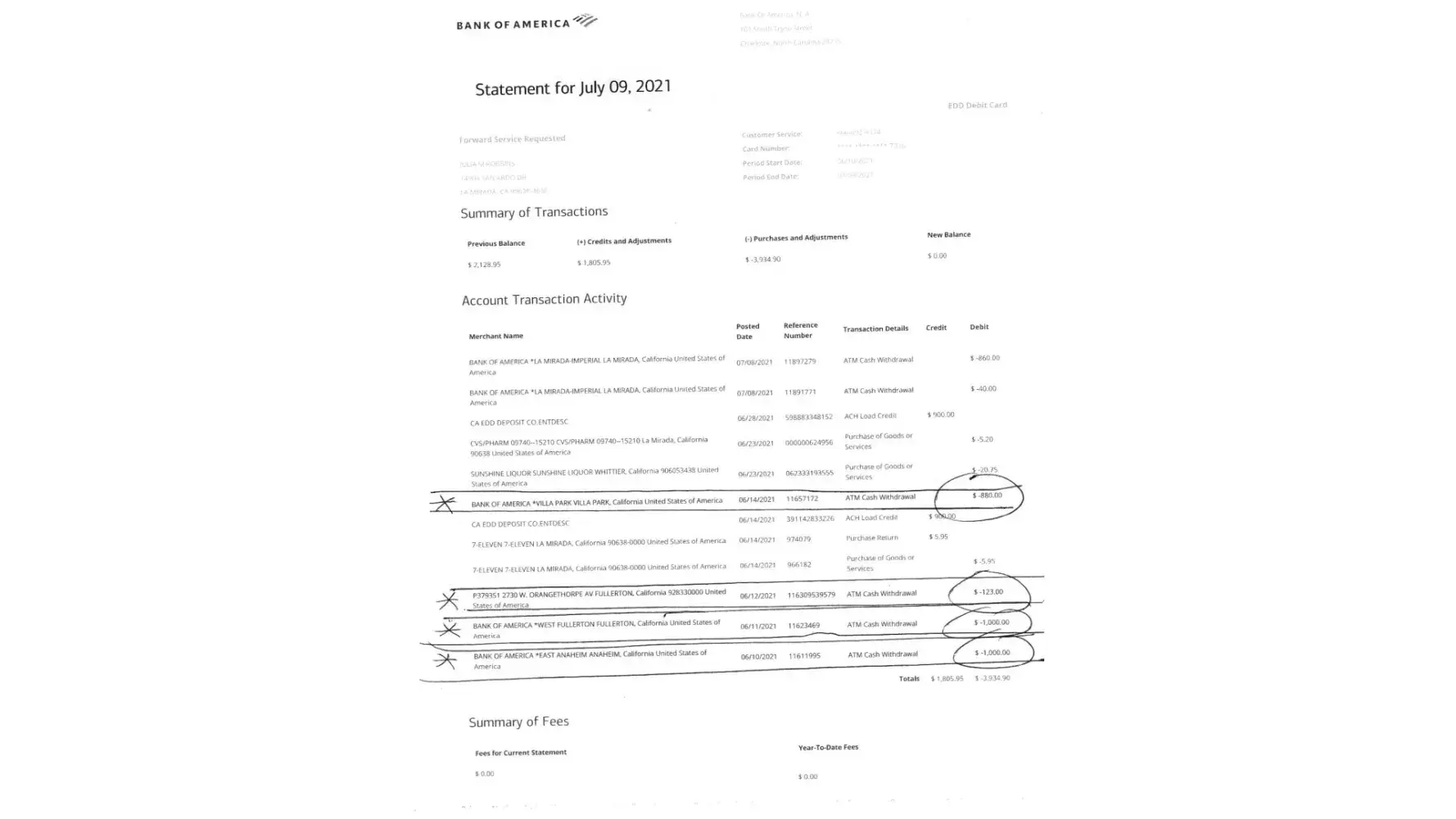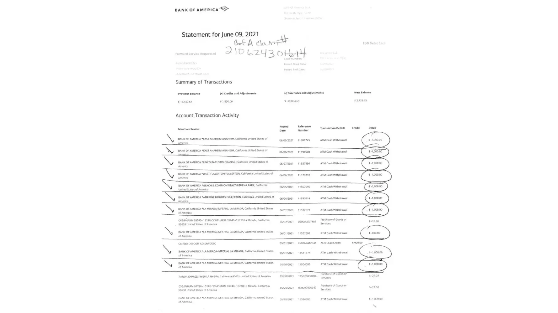 On Sunday, June 20, 2021 at approx. 9 pm I tried to use my prepaid debit card at 7 11 and it was declined. So I called on Monday June 21, 2021 to find out what the problem was with my card. I was told that I needed to go down to the bank to verify my identity, so I did. I went to the Bank of America in La Mirada. I asked the person on the phone if there was a problem with my account and they just said i needed to verify my identity but didnt say the reason for it. So when I left the bank that day I used it at a liquor store and at cvs but the cvs declined my card due to lack of funds. The last time I checked my balance there was about $12,000. I went home and called b of a again to report fraudulent activity/theft, and the girl that helped me told me to check my monthly statement, so I did and when I did I discovered several ATM withdrawals that were not made by me at several different B of A locations. On the 24th of June, I went back down to the La Mirada branch with my printed statements showing the fraudulent activity/unauthorized ATM withdrawals, and I had to verify my identity a second time, and after that was done, the person on the phone told me that they would be sending me something in the mail to fill out and send back, which i never did receive. They also issued a new card which I received in the mail shortly thereafter.