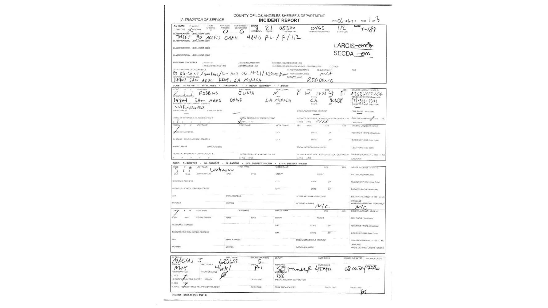 I am enclosing a copy of the unauthorized withdrawals and the police report filed on 8/6/21. Officer Macias stated that the report number [protected] was all you needed, which was incorrect information so I am now submitting a copy of the police report.