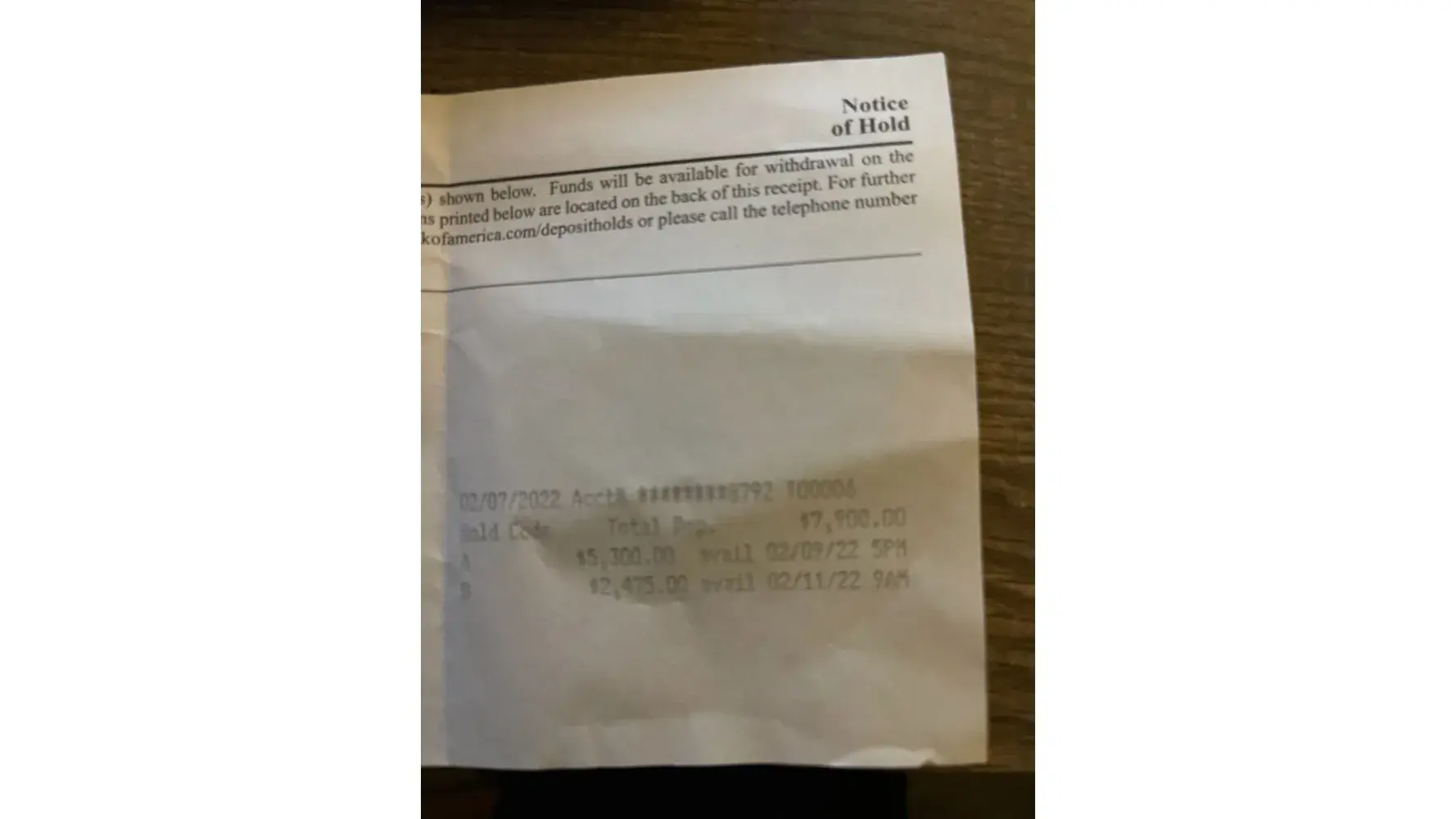 I am so fortunate to win $10,000 on Sunday. Right on time because I owe everyone. They asked how I wanted it cash or check. I asked for a check for most of it. Next day, Monday, 2/7/2022 10:30 a.m., I deposited the check inside with a teller. They gave me a receipt stating that I would get a portion of it by Wednesday 2/9/2022 5p.m. and the remainder would be Friday at 9a.m. 2/11/2022. On Tuesday, 2/9/2022 I paid bills and checked the status, ONLY TO SEE they have put an extended HOLD for the entire amount until 10 days later 2/16/2022. The check was written from a Billion Dollar Casino in MD. They assured me that the hold is 24 hours. I've been a patron for over 15, years of Bank of America and I get a directed deposit every friday. I am being punished because I bank here. I live paycheck to paycheck unfortunately and really, really need this money. To hold the entire amount for 10 days is cruel. You sucked the joy out of this experience. I am taking this extremely personal because it is the second time something like this happened. Last time, I was relocating and pulled money out of my 401 K. They made me wait 21 days. I lost my apartment that time after just signing a lease because of the hold on funds. THE KICKER is My car payments, insurance, rent, utilities, cable, payments are all be returned because of this RIDICULOUS HOLD. (I happily paid all my bills Monday night). I have the receipt if anyone cares to see it stating the release of $5,000 wed and the balance Friday.