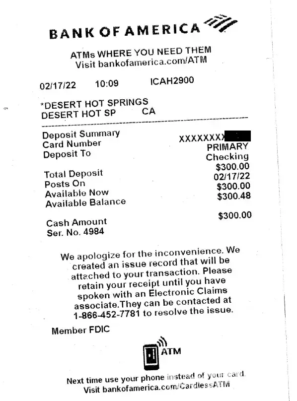 Next, the ATM dispensed a receipt to me showing I was credited $300? The receipt states "We apologize for the inconvenience. We created an issue record that will be attached to your transaction." WTF?