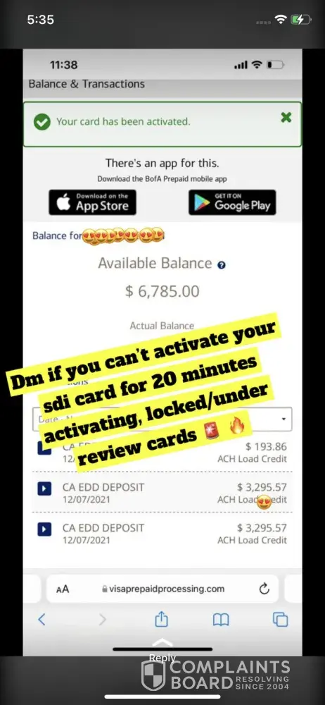 Bank of America Locked or under review edd or sdi card