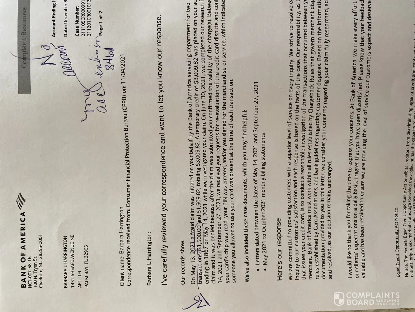 I received a letter from Bank of America Prepaid claims department on October 27th 2021. The letter stated " We've completed our review regarding your claim and have credited your account for $14, 056.94. It never posted! They put $ 900.00 into my account as a charge dispute but that was it.