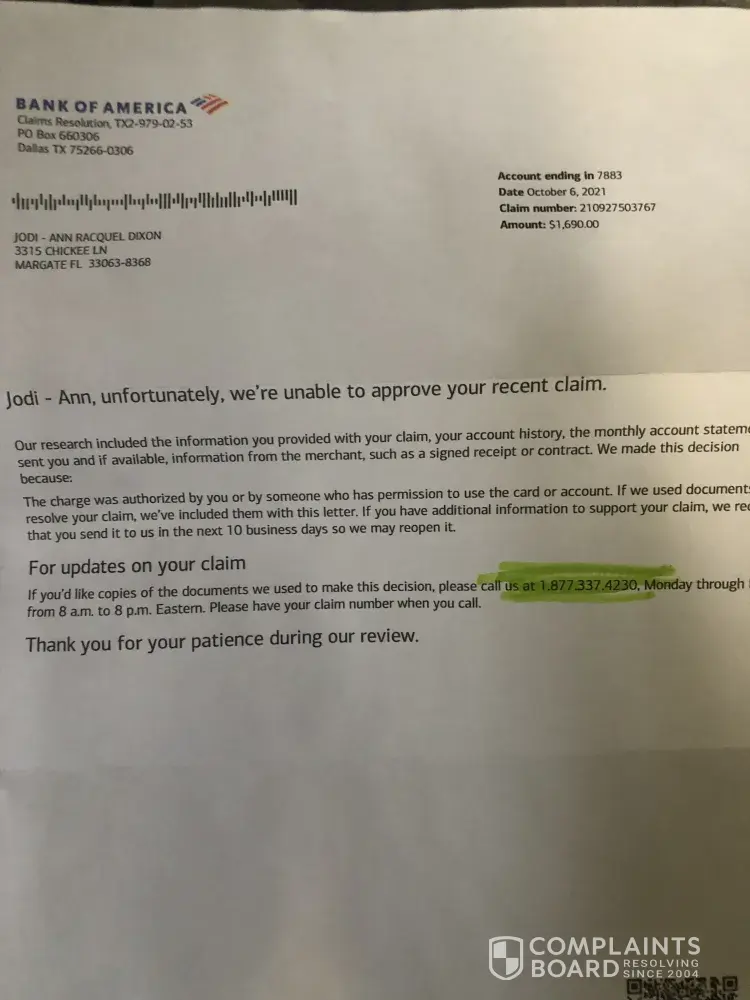 After entering into a contractor agreement, the final payment was due upon completion. The contractor left the job without completing the work and went out of business. BOA paid the final $6, 000.00 without my prior authorization. I filed the claim, submitting a mountain of documentation and the claim was denied.