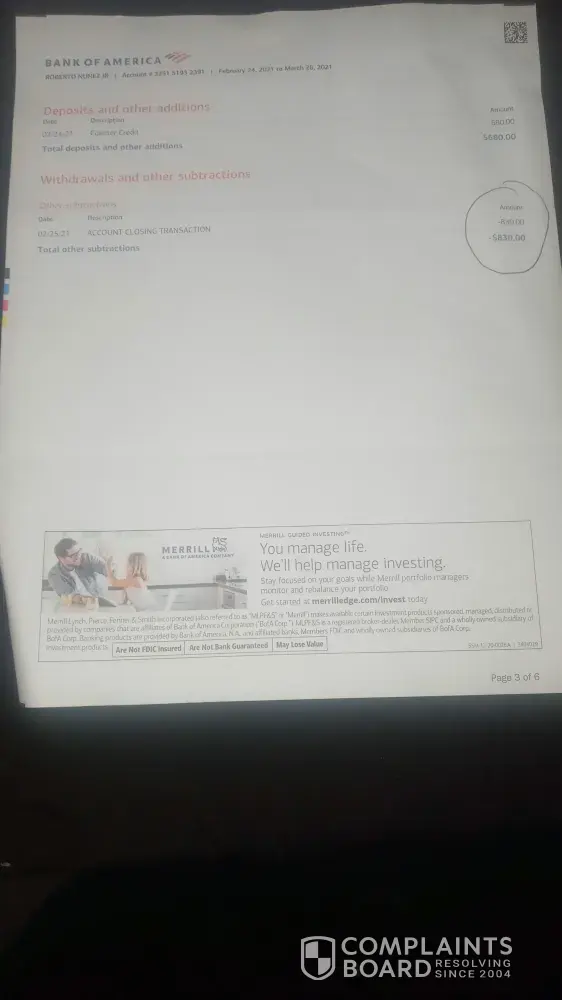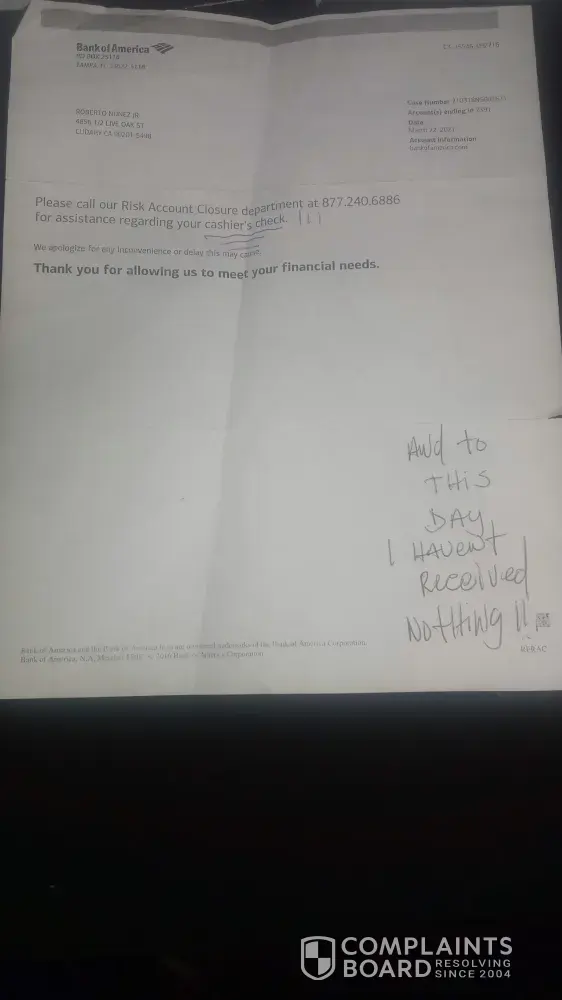 Since that time, Bank of America has held the funds and each time we've called for support - Bank of America has given us a variation of stories as to why the funds are not back in our account.
