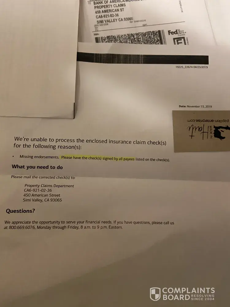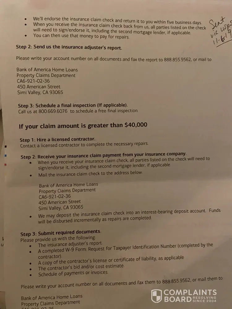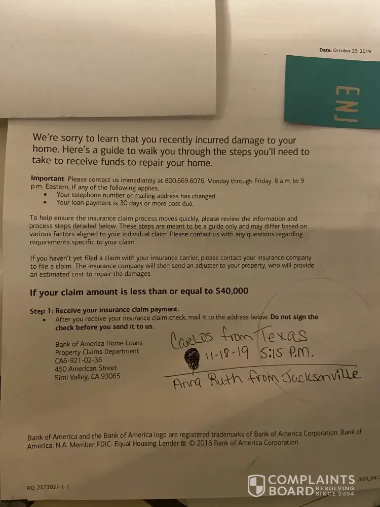After speaking to a representative from Bank of America on October 28th, 2019 regarding my property claim, On November 2nd I receive a packet from Bank of America with detailed "instructions" on how to ensure the insurance claim process moves quickly.in Bold print it tells me to not sign the check and send to Bank of America. I send check on the 6th of November, 2019. On November 18th, I receive a fed ex envelope with the check back but this time requesting my signature. A phone call was made to Bank of America at 515 PM upon receiving this fed ex envelope at my doorstep. After 15 minutes of getting placed on hold and/or shuffled around, I than spoke to Anna Ruth from Jacksonville. During the conversation with Anna Ruth I was told I would be having to submit my contractor's information before they (Bank of America), would release funds via check with my name and my contractors name on check.. is this a joke? Since my account was past due at time of loss, in which I hated that it was, this was the process they would have to follow. 5 years with paying every month and having no late payments. A person falls into a hardship but continues paying on mortgage only to find more of a struggle. My account is current, and paid up until next payment due date of 1-1-2020.in the real world you just can't have a contractor come and do work and have to wait to get paid. Reverse the roles, and I promise you, having to jump through additional hoops to appease Bank of America would be the last thing you would want to be dealing with at a time of loss. "We're here to help!" Is that the quote for BOA? That is not correct. That is a false statement and should be the last statement that's stands behind BOA!