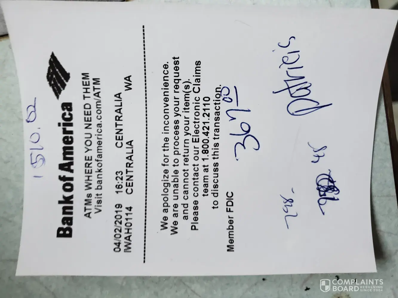 On april 2nd, I made a cash payment to my credit card in the amount of $367 at the atm in centralia, wa. my cash was taken and not returned or credited.