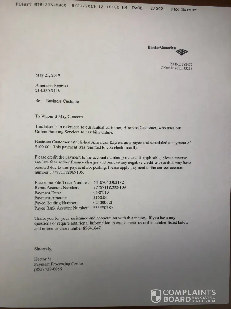 May 25, 2019 I receive the letter from Bank America indicates that no bank error was made and payment record is valid and will not be removed. "30 days past due in April 2019" I di-s agree with this Bank statement for the reason that its's the bank employee mistake in processing the payments. for what ever reason and nobody was doing the effort to check. It should have been corrected and be reprocessed ( re-send with the correct check number). I never thought that this easy problem to solve this will cause my name to be dis-credited. May 28, 2019 I have called the Trans Union, Equifax, and the Experian and explain exactly what happen. I also request them to file a disputes that I do not agree what you (the bank) statement that I was delayed in my payment that gives a bad record on my personal credit Rating.