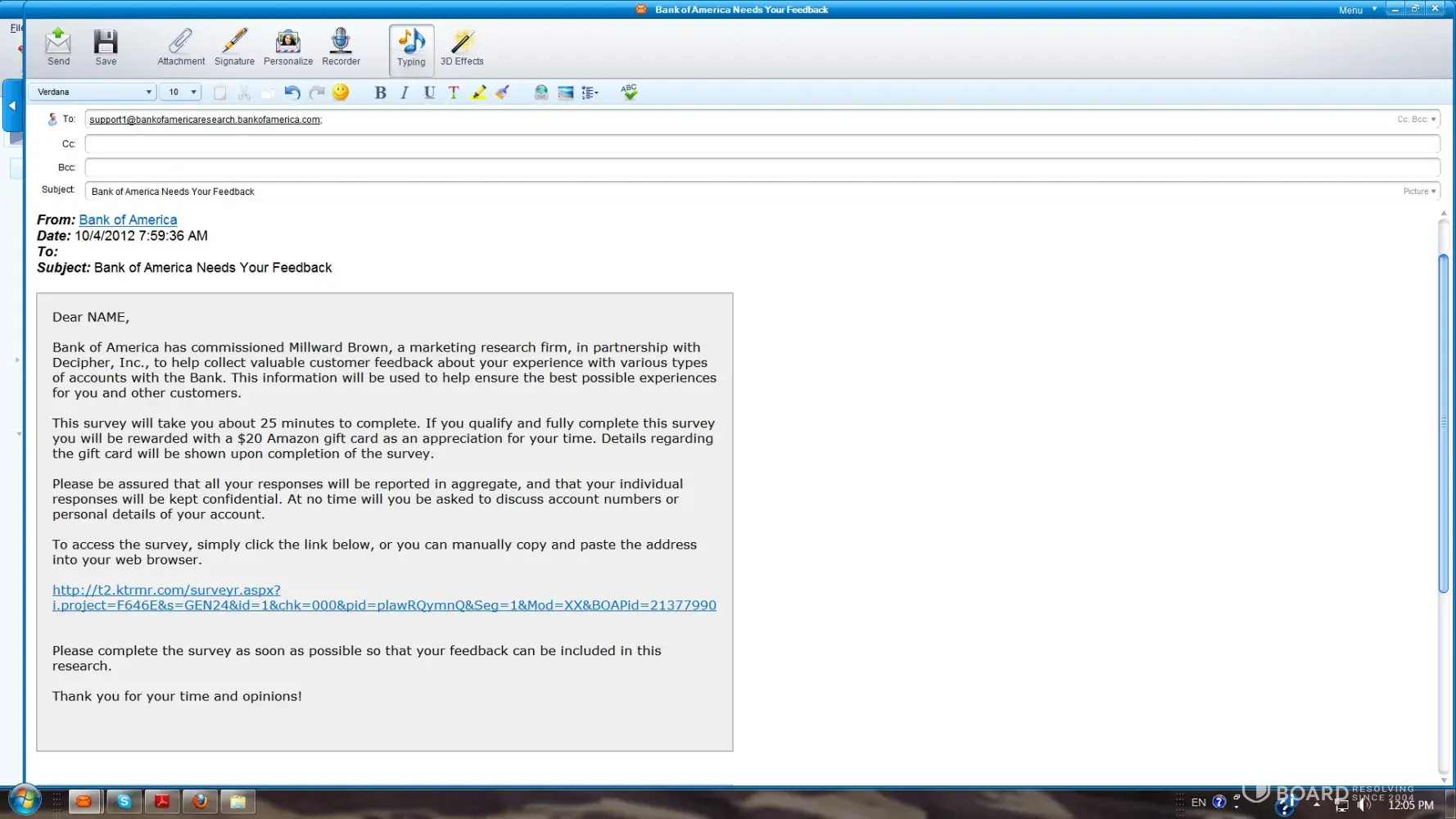 Deceiving message about $20 Amazon reward for the Bank of America survey completing. Possible phishing site.