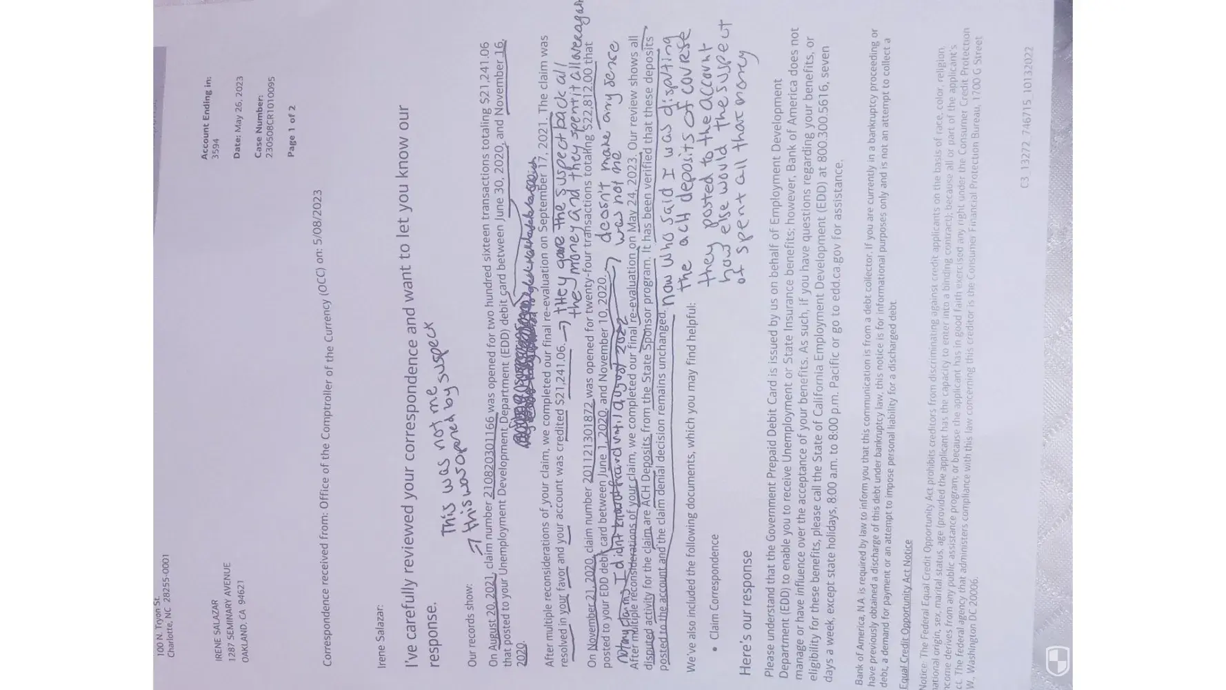 Thank you for responding to my claim I have been struggling with this for nearly a year now you see when I applied for unemployment back in april of 2020 I caught covid and it nearly killed me I spent the remainder of 2020 hospitalized by the time I was discharged I tried to call and check on my claim status but back then you could not get anyone to answer a call so I assumed I wasnt approved seeming there wasnt a single piece of mail from edd in my mail. Well time went on and in august of 2022 I got a notice from the irs stating I owed money on the unemployment funds I had received. I was shocked so I called edd they told me to call bofa immediatly and when I did they confirmed that a card had been activated in my name and all the funds were gone. Then I get transfered to the claims department only then is when I learned about this person not only used up all my edd funds but they also made a fraud claim in hopes to get that money and spend it again. So when you see my account its just a mess due to this suspect making false fraud claims and I feel like it makes it harder to understand what my claim is. The first time I found out about this going on was in august of 2022. So the transactions im desputing are the ones made between june of 2020 thru november 2020 hopefully someone can take the time to understand and read my comments.
