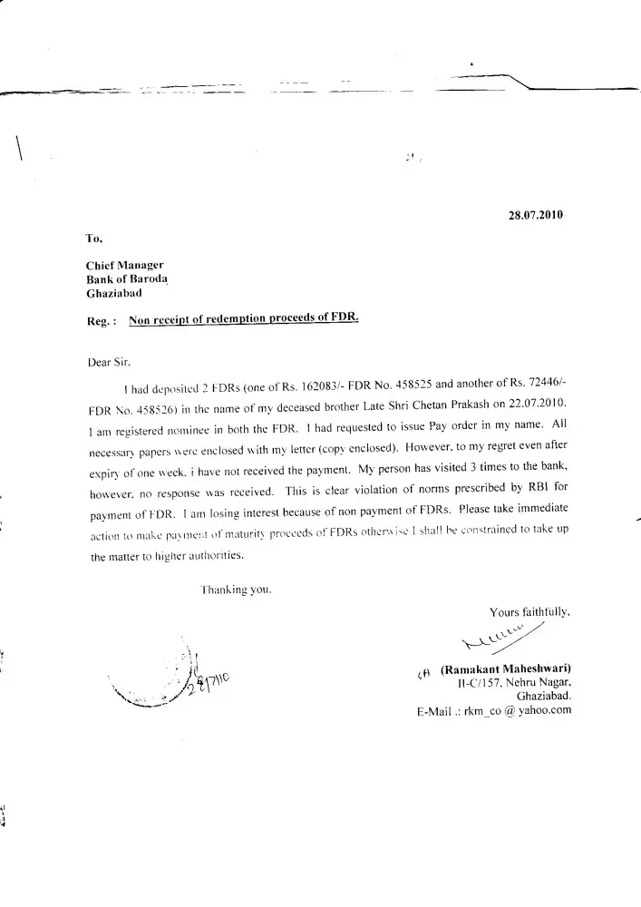 Bank Of Baroda non receipt of redemption proceeds of fdr's