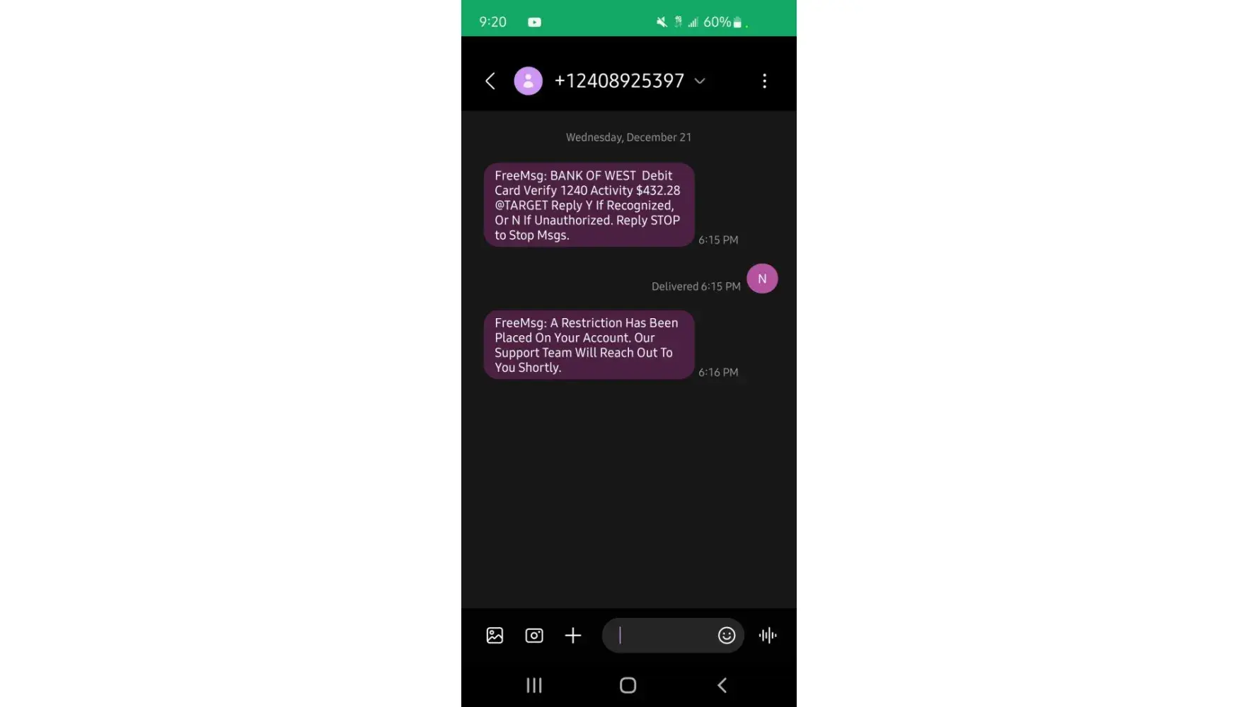I was traveling on Oct 21st 2022 through Denver International Airport. I lost my debit card. I reported the card lost. I received a new card when I returned home. On or around December 20th 2022 I received a text message from this number [protected]. Attached is the text message saying a charge is trying to go through on my card ending 1240 for $432.28. Enter y for yes or n for no if this charge is or isn't valid. I was at work and I received the text and entered no. Then I received a follow up text that said A restriction has been placed on your account. Our support team will reach out shortly.