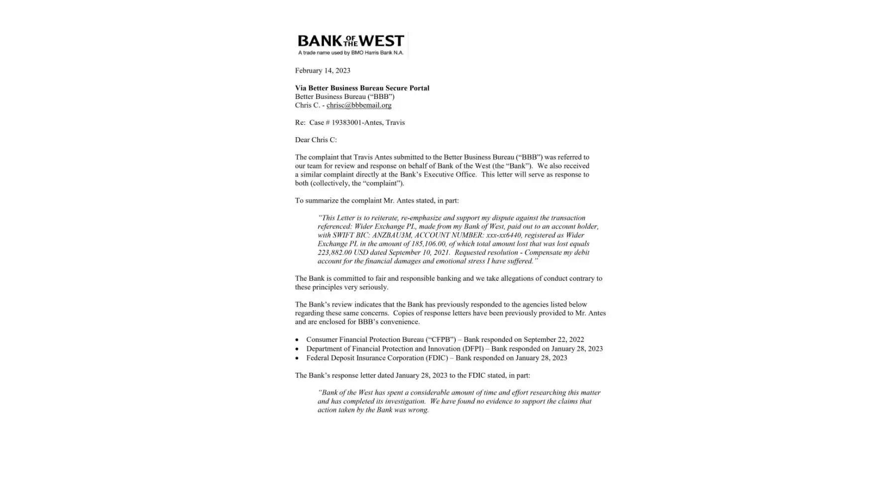 I am a single Father to two children, my daughter Ariel (12 years old at the time of the crime) and my son Lukas (14 years old at the time of the crime). I had to list and sell my home where I was raising my children to simply just stay afloat financially. The wire fraud and failures of Bank of the West to support and serve me as their long-time customer, have led to significant emotional trauma and financial insecurity for me to provide for Ariel and Lukas' futures. I implore you to use your extensive capabilities and influence to assist me in recovering my stolen funds lost from this banking scam and ask for your help in holding Bank of the West accountable for their ethical, moral and legal failures. To me, it doesn't make sense; if you are serious about doing business and your reputation, then I believe that at least one of the above should be a fair and reasonable outcome.