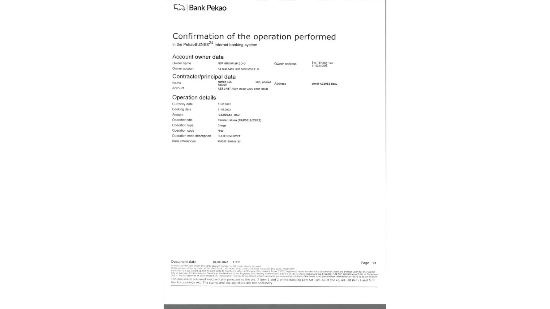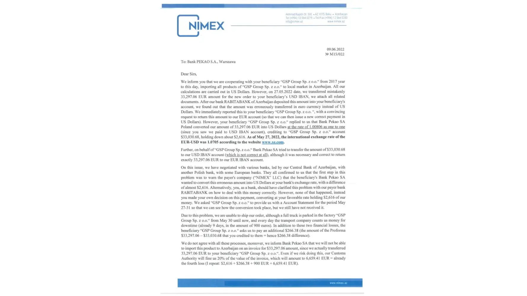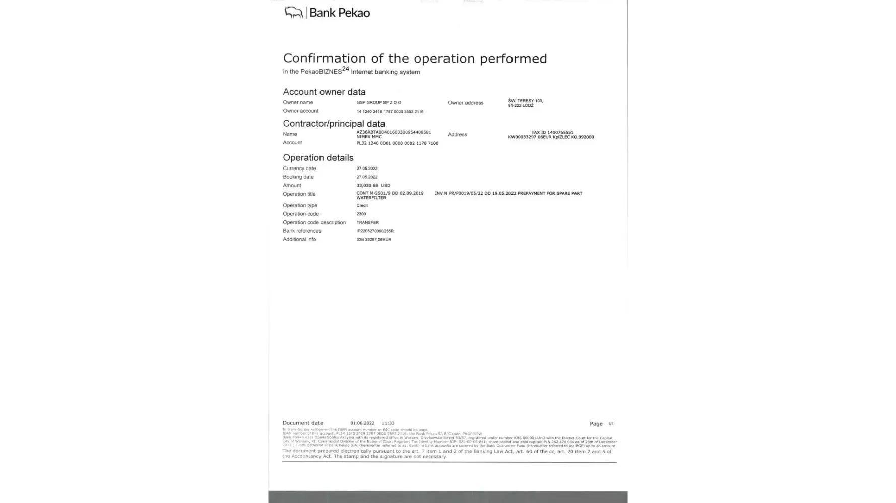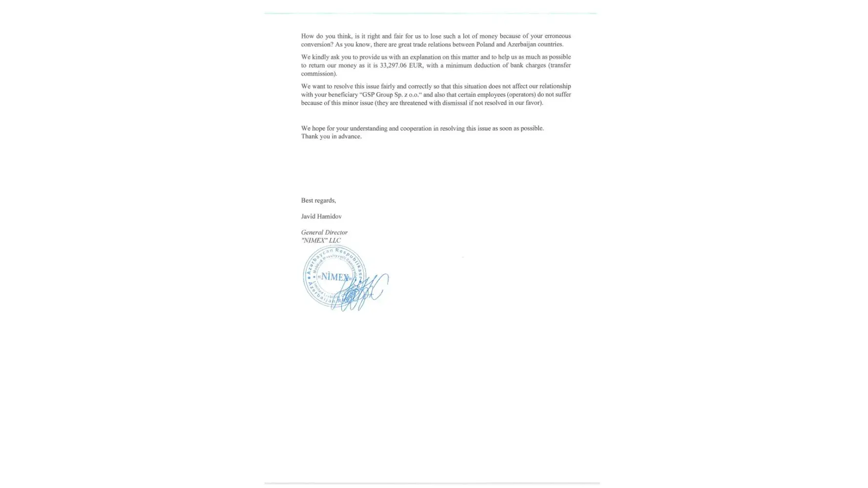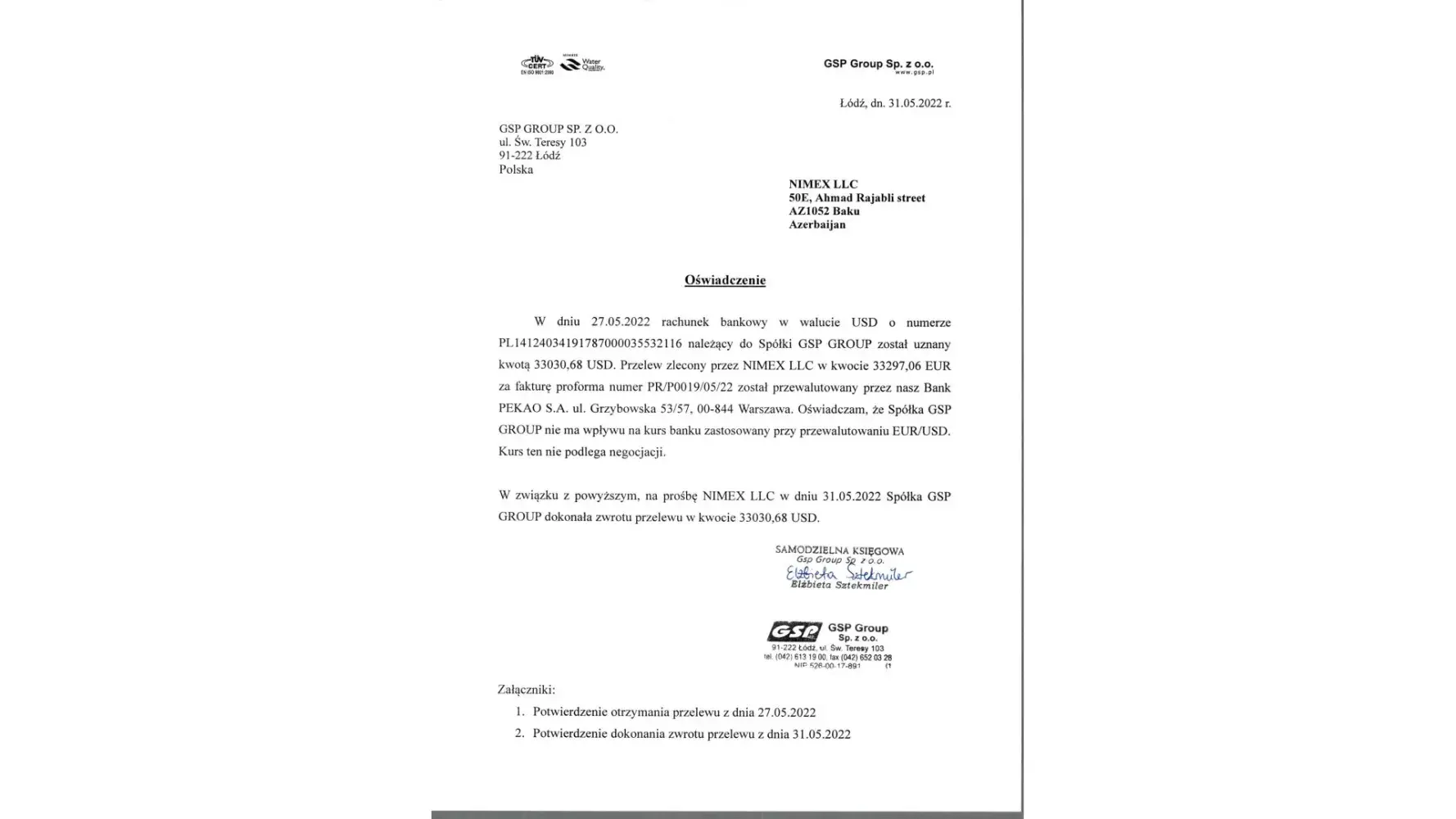 With this letter, we would like to inform you that on 27.05.2022 we mistakenly transferred 33297.06 EUR to USD IBAN account of your beneficiar “GSP Group SP. Zoo†instead of 33297.06 USD.