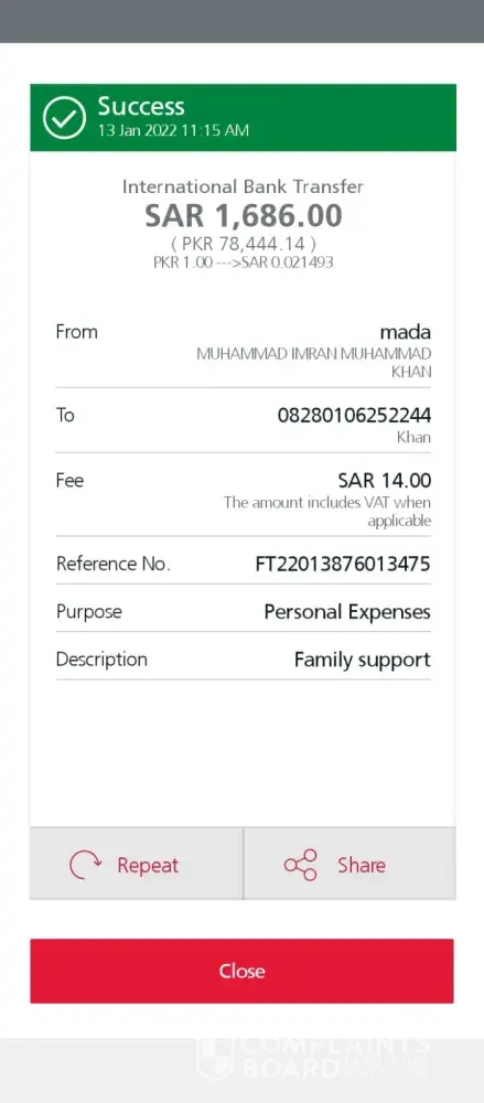 I was send money to my wife her Name is Rameen Khan, Her bank account number [protected] I was on above Ac 1686 SR dated. 09/01/2022 But still not received. My personal Information Muhammad Imran Muhammad Khan NIC. [protected] Passport Cl1223923 Iqama. [protected] Pakistani Money send for Family support. I went Enjaz bank, branch Aqari They...