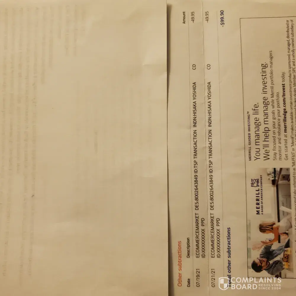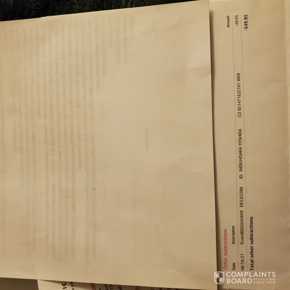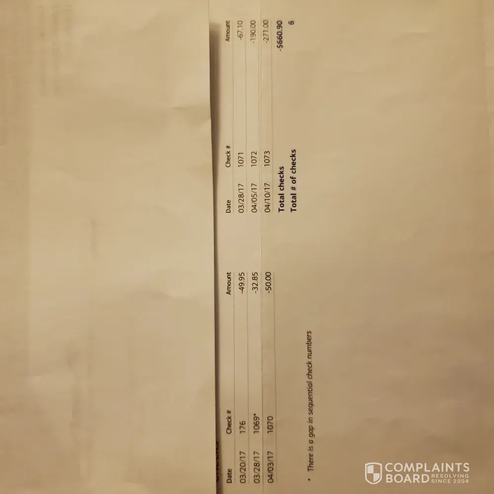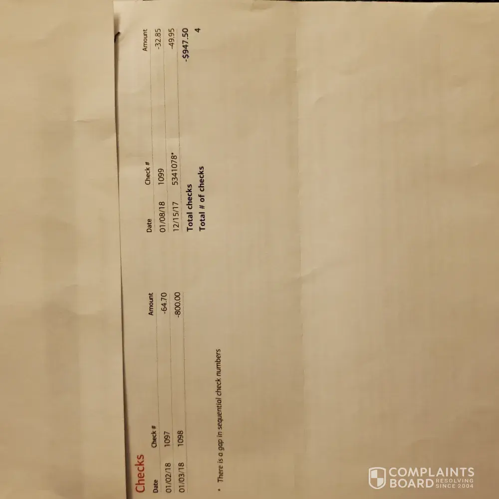 The unauthorized withdrawals in the amount of $49.95 started on March 17, 2017 - check #176. April 17, 2017 - check# 177. May 25, 2017 - check# 178. June 15, 2017 - check#179. July 17, 2017 - check#180 Aug. 15, 2017 - check# 181. The check numbers became 7 digits long on Sept.19, 2017 - check# 5334069 / Oct.18 2017 - check# 5336413 Nov. 15, 2017 - Check#...