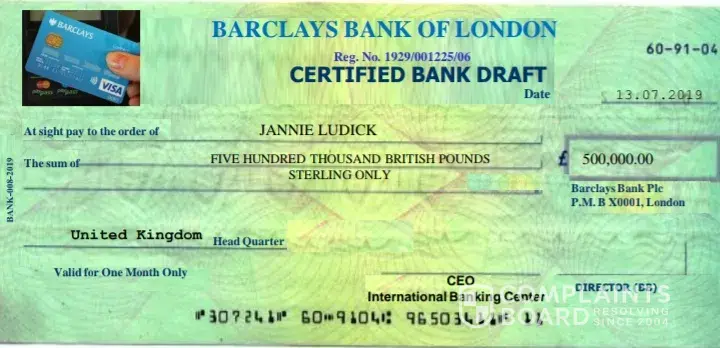 This draft send by Melody Maria cont no is +44-[protected] and take money from me 50, 000.00 for process charge on the account of