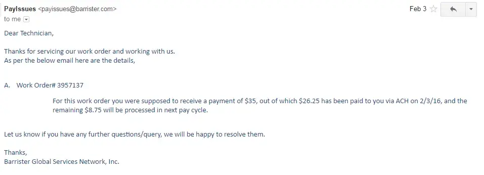 Barrister has responded to this individual and resolved his concerns. We work with all of the techs who perform work for us, and we pay on time. Ask the over 2, 000 techs who worked for us in 2015. Compared to a few negative posts, you will quickly see where the problem may lie. When we work with a tech repeatedly and they continue to complain about the exact same issue over and over, even once it has been resolved they continue to re-visit the instance, and they find fault with every term and condition and process, it becomes expedient for both parties to discontinue the relationship.