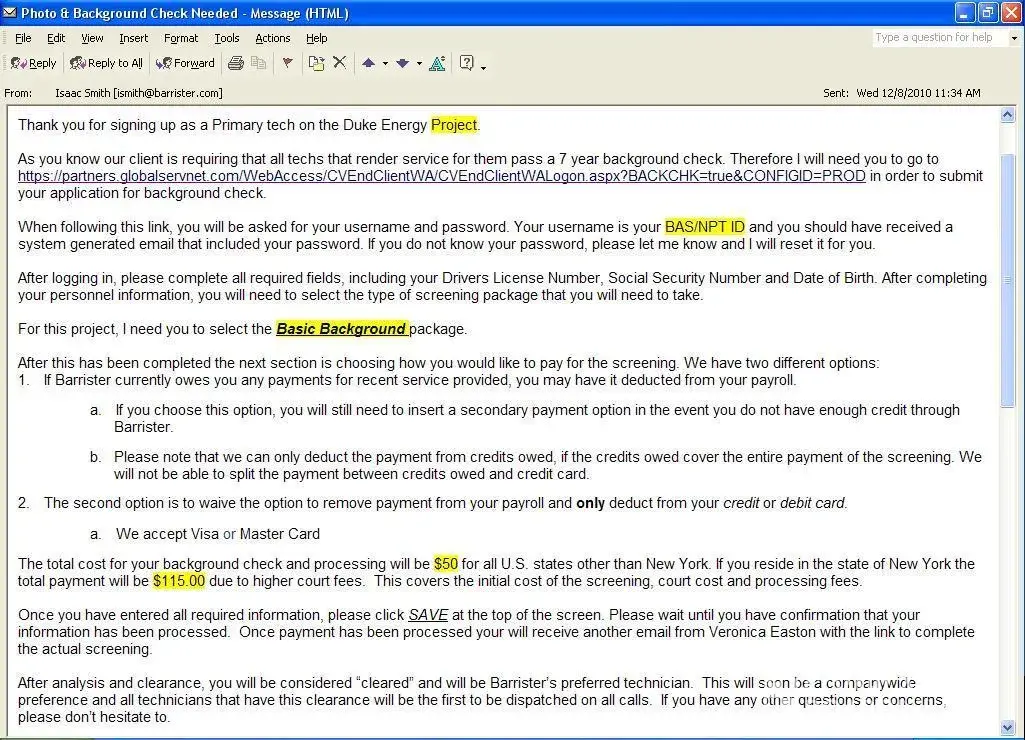 On Saturday, December 6, 2010, I received a call from a person named "Iassic Smith" from "Barrister Global Services". He said that they had multiple customers my area and that they needed a technition for that area to do electronics repairs. I did a search on Barrister International through both Yahoo and Google. I should have known it was a scam when thi...