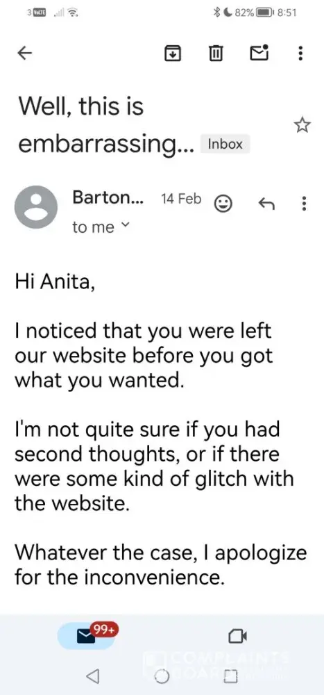 3. I was shocked on noticing the transaction of $384.92 billed. I wrote to Barton for my money back. Joe Barton's reply to me is not an automatic one, as attached in photos. He acknowledged that it's embarrassing that the transaction was incomplete and suspected there may be some error in the website.