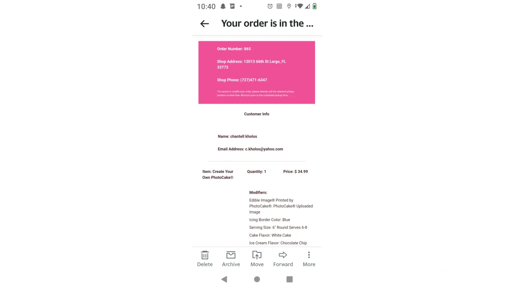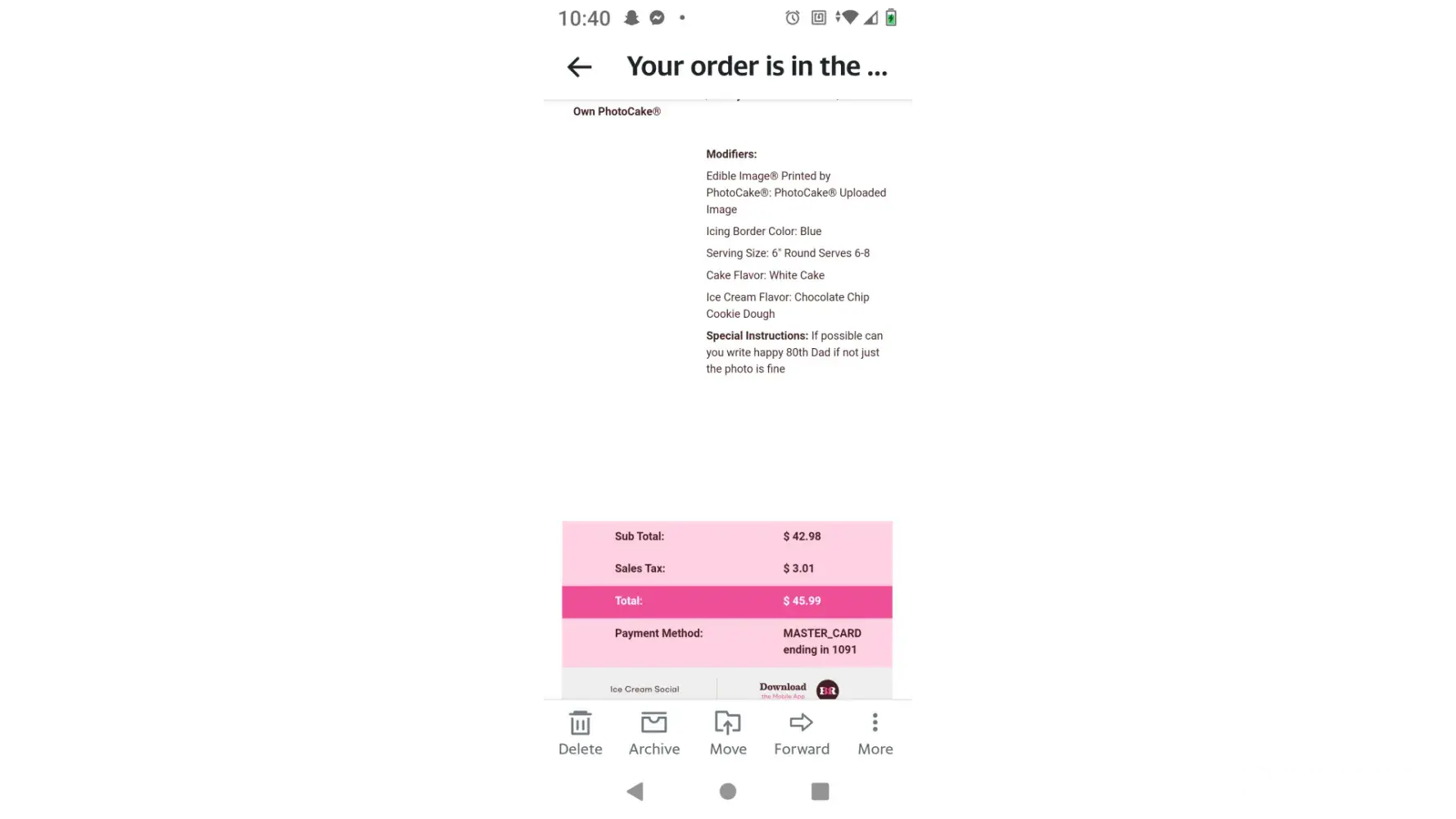 Ordered a small photo ice cream birthday cake Don't get me wrong it was delicious, but it was smashed on one side, icing was covering his dog just absolutely disgusted after what we were charged for this tiny cake and it was for my father's 80th birthday. This will teach me to look inside the box before I pick up a cake from you guys ever again I do feel that you owe me a reimbursement for this I would truly appreciate it thank you so much. [protected]