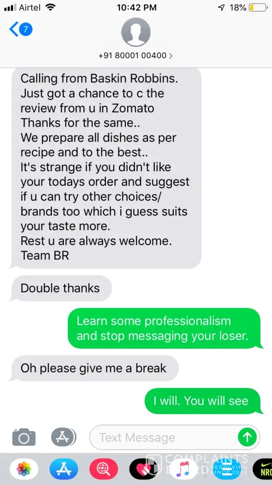 After receiving stinky ice creams with stale taste, i posted a review (from one of my family member's account) on zomato for baskin robin sector 16 zomato order. Immediately i received a call on my number form which i had placed an order. I received 3 calls which i dint answer as it was 10:00 pm and too late for my schedule to be awake . I got a message from the same number (screenshot attached in this email) where the person who called had written that he was calling from baskin robin and wanted to talk on the review that i just posted. the moment i called back the guy (from baskin robin calling from number +918000100400) he started abusing me asking how dare i put such a review on zomato. He did not ask me what was the issue i faced or what went wrong with the customer considering these people work in service industry, He talked super rudely and mocked me asking "if i have ever tasted ice creams before" and "if not i am free to go and try some other ice cream brand that suits my taste". I constantly reminded that guy that he is in service industry and he isn't suppose to talk like this to which he said "Oh please, give me a break". we ended up in big unprofessional argument with lot of abuses. After this call, i again wrote on the review citing the example and stating the incidents as it happened on my same review as another comment. This guy messaged me on my personal number right after my second review saying ' Double Thanks'. And after that he kept messaging me on my personal number and telling me to give him a break and saying nasty things to meet .