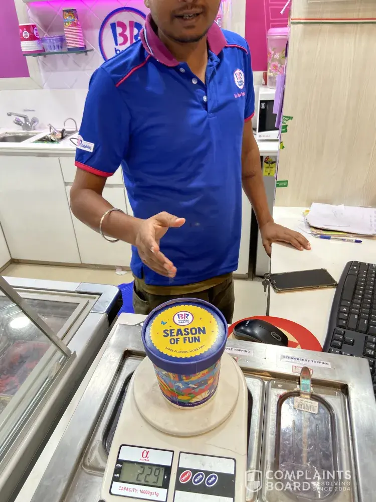 Yesterday on 21.10.19 around 9.30 pm through food delivery partner swiggy I had ordered a 700 ml california almond ice cream tub. On receiving the same from the southern avenue outlet I found that the quantity given is much less. I had my doubts and hence rushed to the outlet and asked them to weigh the ice cream. It appeared that the weight of the tub was only 222 grams. I had paid for 700 ml of ice cream. I was also told that for 700 ml the gram conversion as per baskins official chart was only 368 gram. This was also bizarre and I asked them to show a proper chart from baskin whereby they can show such details, since they are charging per ml, but delivering per gram and hence cheating on quantity.