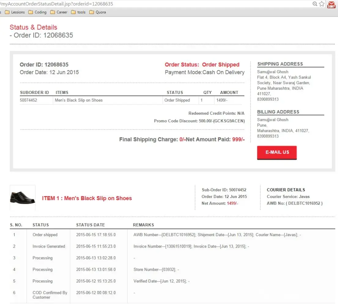 Hello I am writing for order id: [protected]. I placed this order on 12 Jun from my mobile app with Coupon code: GCKSG9ACEN for pin: 411027.in Bata website it is showing that the order is shipped. After few days I enquired with Bata customer care and they gave me the same information, then I called "Javas" and asked about the item they said item was returned on the very next day 13 Jun.