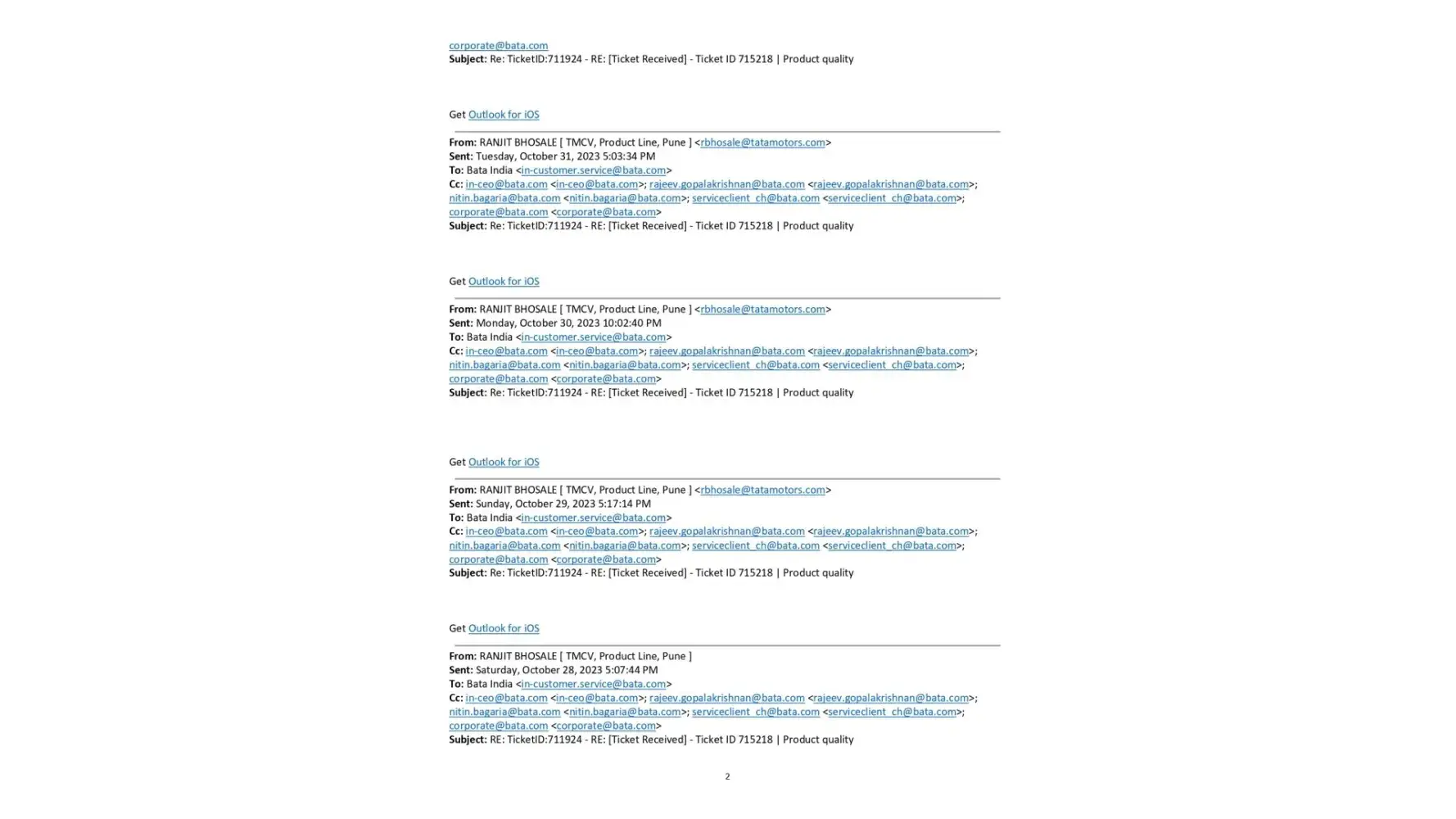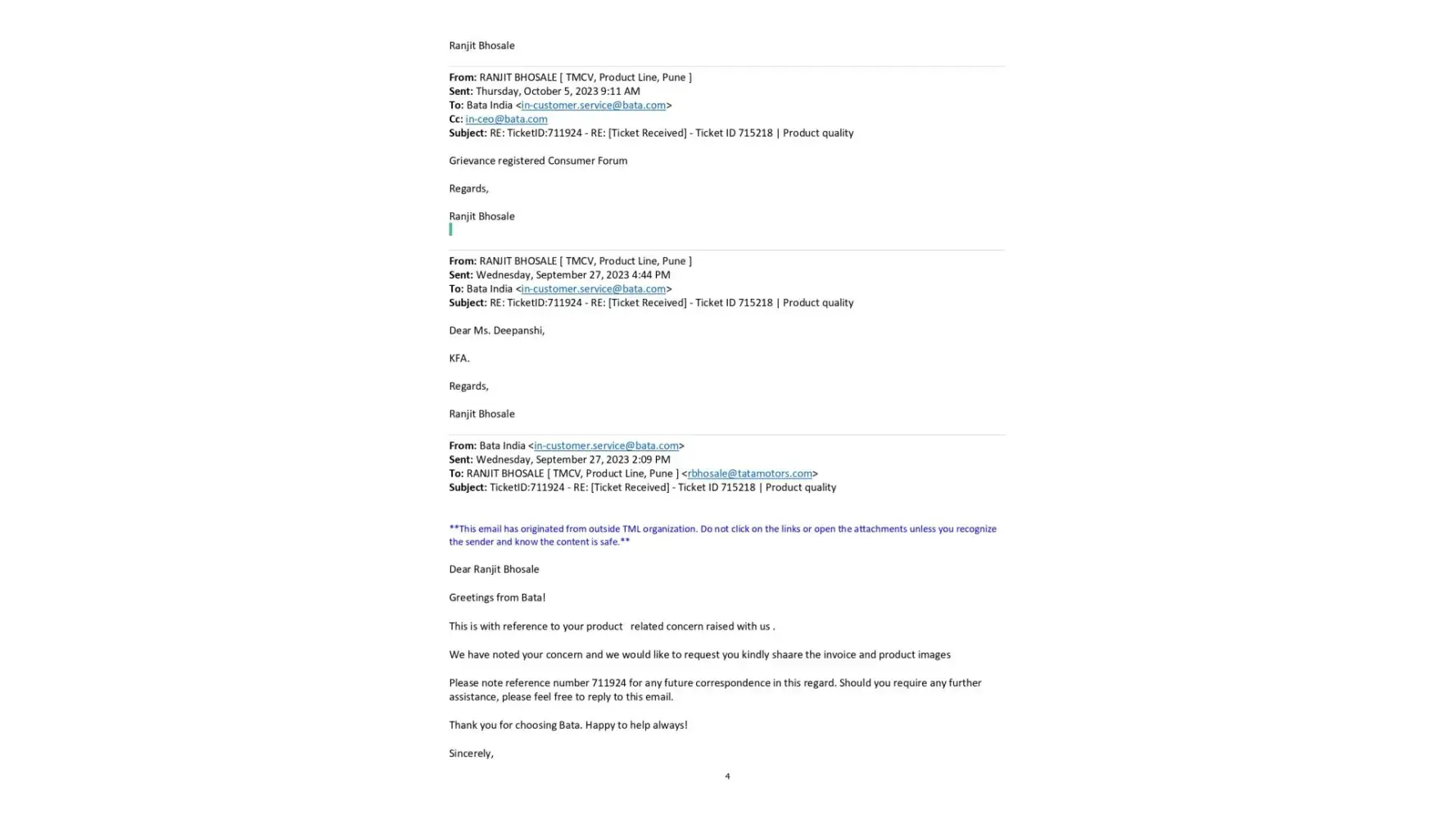 A copy of email to Bata India Ltd: