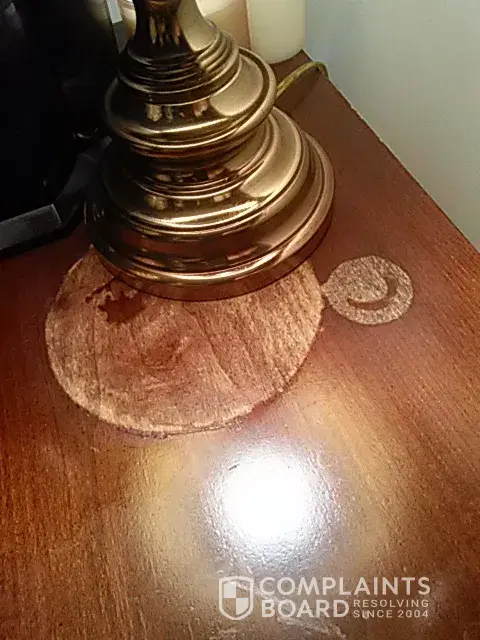 anything oil based will eat through wood. I set my perfume bottle on my dresser and it did the same thing.