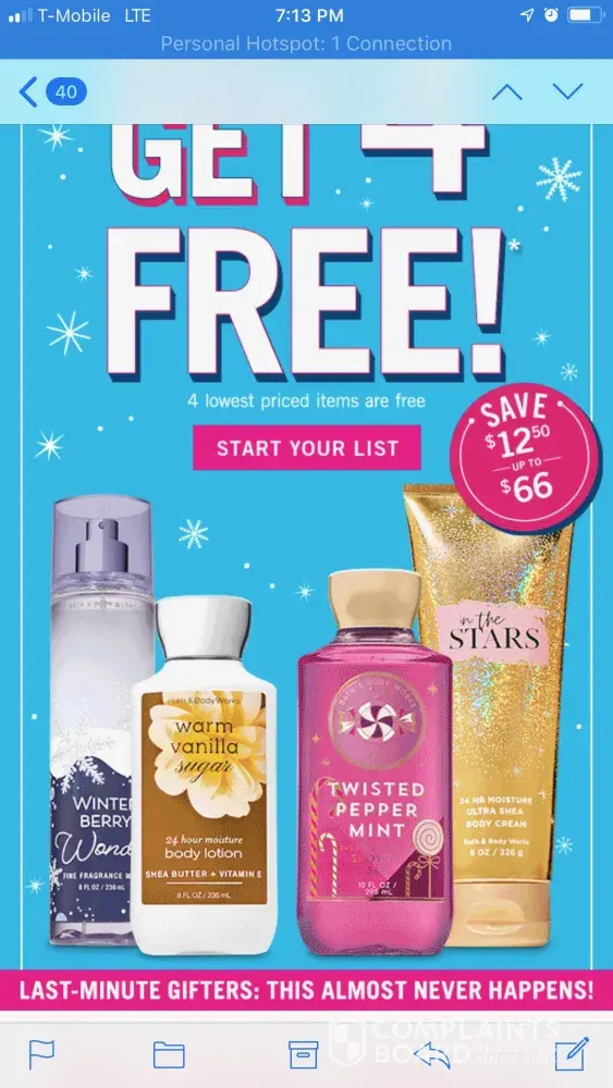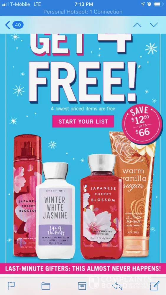 I purchased 3 items and supposedly got 3 free of equal or lesser value. After looking at the receipt everything was marked down and nothing was "free". When I asked the cashier what is free she attempted to get out a calculator to show me where and what is free. After several minutes of looking confused she stated that "basically" their free but there's a lesser charge just in case of a return. I told her either it's free or not free but there is nothing basic about this fraudulent sale. I asked for my money back and returned the entire order. I'm very disappointed in bath and body works for false advertising and will no longer buy from there.