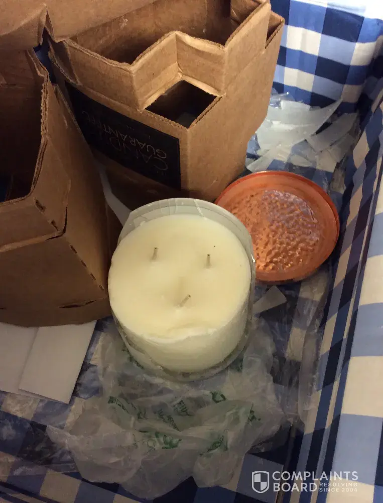 Damaged candle, tried email and 800number requested a callback received call back I answered immediately and was placed back in que with very lengthy que. not customer friendly. Have photos of candle in shipping box. Just want a response from someone.