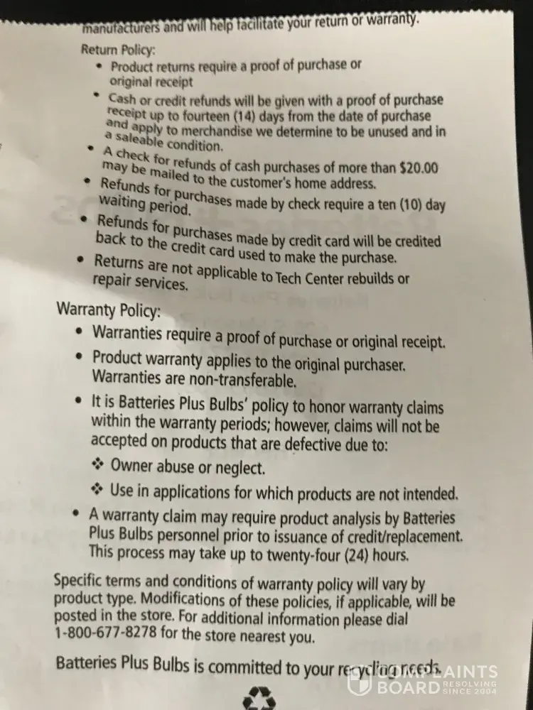 Batteries+Bulbs #997 18541 Hawthorne Blvd. Torrance, CA 90504 [protected] Rick Taylor #EC-[protected] #EC0031705190 Manager Ron called left message to pick-up battery. Go to pick -up battery ordered online at store 5/27/2020 he then quickly tells me they don't really have the battery I order but I can have this other battery made in USA for...