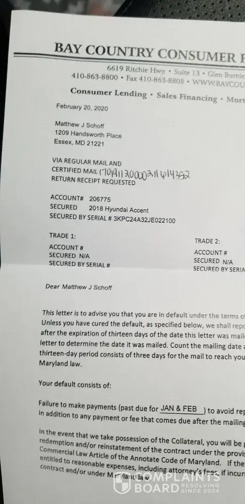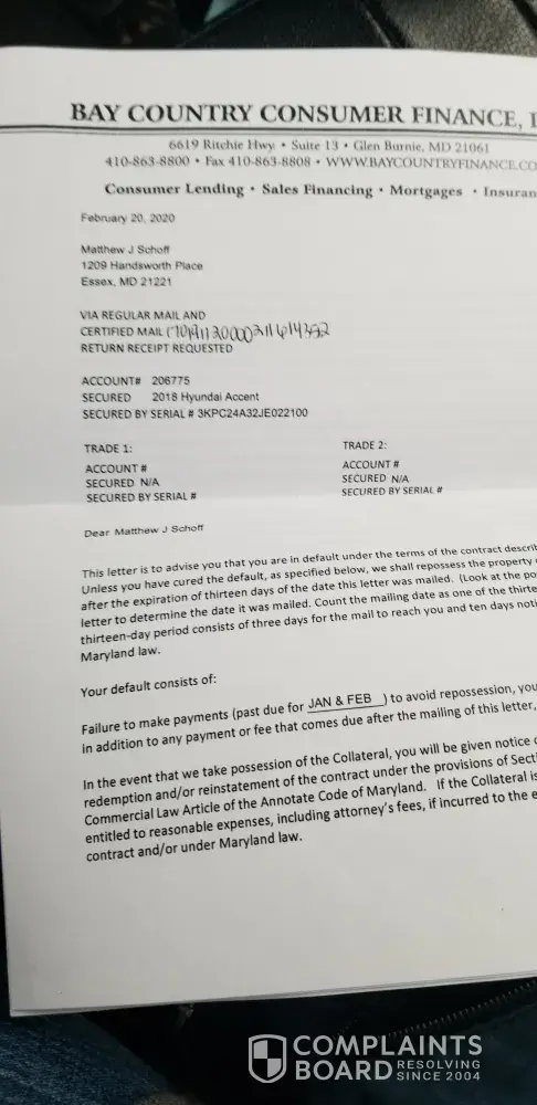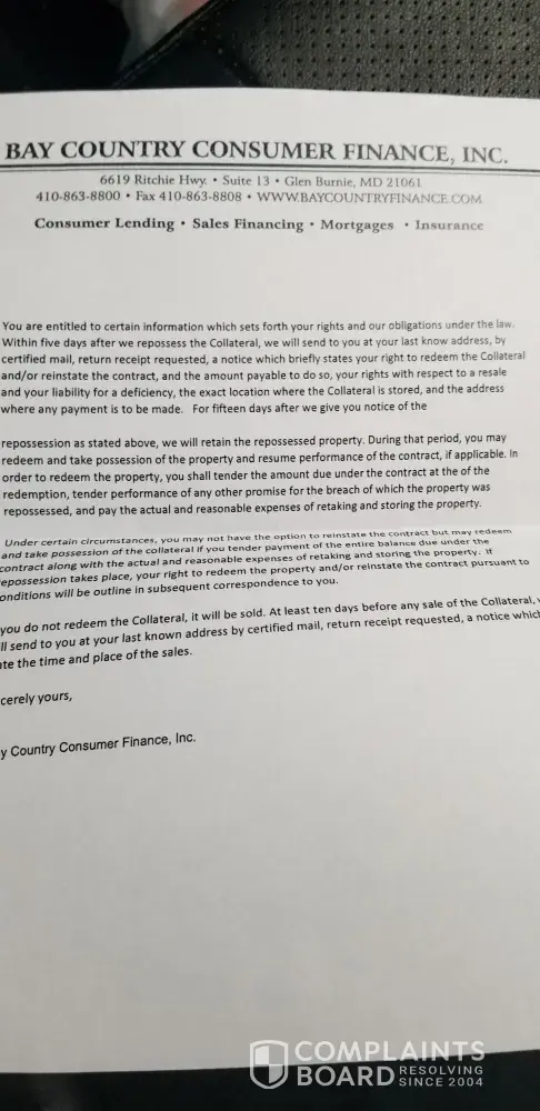 I know people use this company as a last resort myself included. They are modern day loan sharks, who make money from people who are desperate at the time and prey on ppl who are least able to afford the fees and rates required to repay the original amt of your loan. Please be aware. Try all other options before using this company for any financial needs. Originally I borrowed $4, 000.00 by the time the loan I've repaid this loan I would have paid over $9, 000.00. I had medical bills etc to pay had exhausted my savings and had no choice but agree to the outrageous repayment terms. Also, my vehicle was reposed early on for 1 missed payment in the amt of $287.00 and fees along with the tow company charges to redeem my vehicle was over $1000, 00. My experience with Bay Country, has been a learning experience, my purpose of filing a complaint is to make people aware that companies like this one, which seems to be a god sent at first even though you know at the time while your signing your name on the dotted line and turing over your car title it doesn't feel right. But you do it because you are out of choices and Bay Country banks on that and laughs all the way to the bank at poor people's expenses. PLEASE FIND OTHER OPTIONS😂