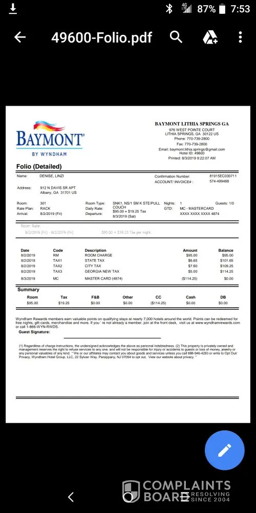 Read full complaintbaymont by wyndham lawrenceburg july 23 to july 26 2019