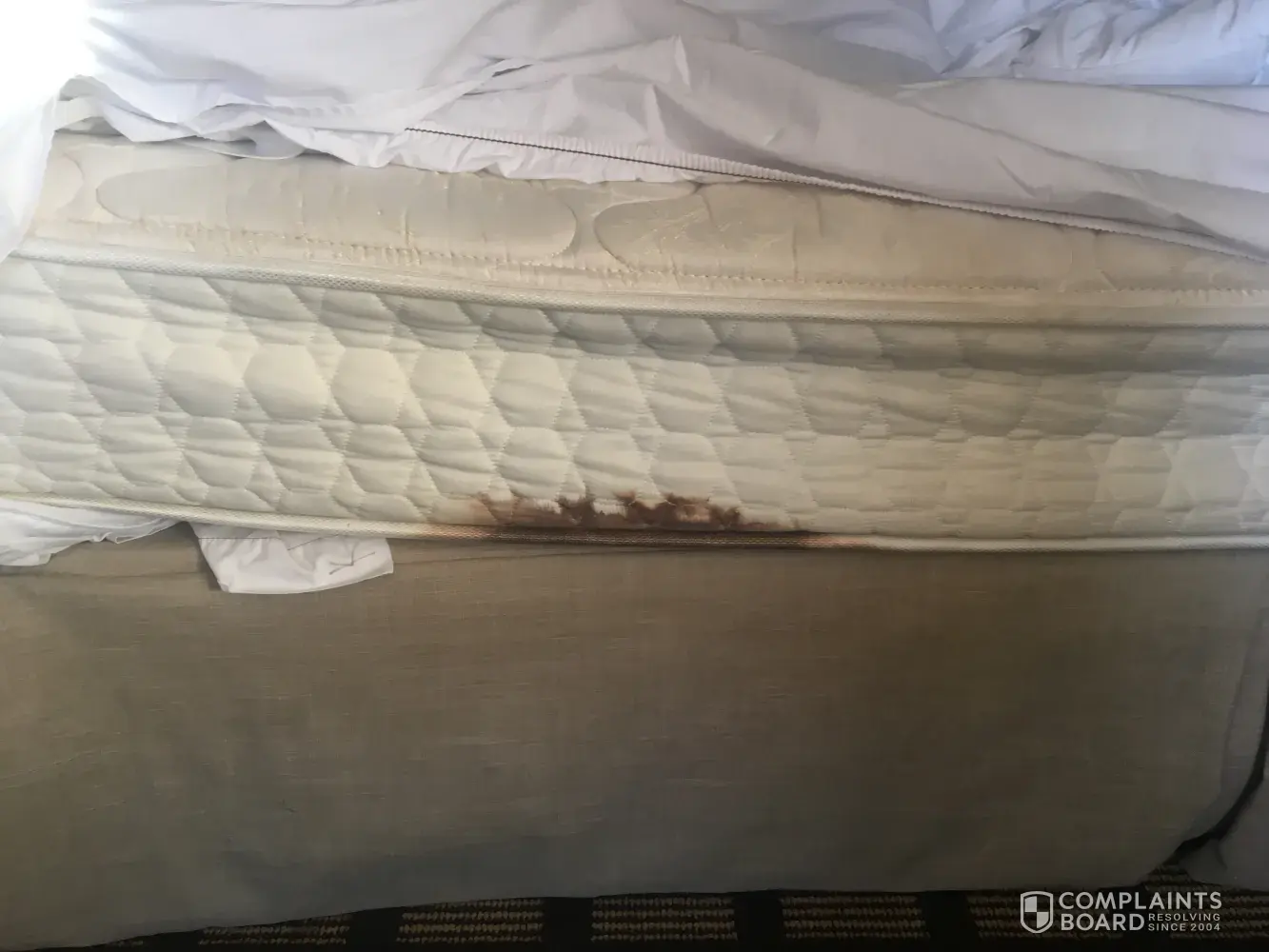 My family and I stayed in a room 219 on Saturday night the 12-15-18. We noticed the door latch was broken (see picture) and did feel unsafe while spending the night but we were already settled. That Sunday am we did notice a large brown/red stain on the mattress (see pictures) it also had a foul smell to it. That Sunday am I went down to the front desk to...