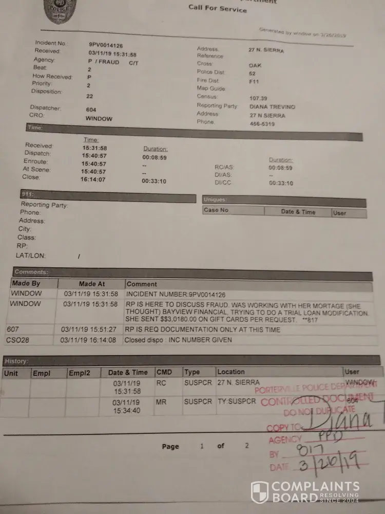 I submitted documents of fraudulent activity from people who are saying they were working for Bayview and helping remodification and it was a scam . My house got sold out from under me and my kids while I was going through stage 4 Breast Cancer and chemotherapy and radiation treatments. I has been I. Contact with them when I Frist got diagnosed with cancer and was reaching out to them for assistance but was passed from one person to another and was always told that they never received my package for modification and I had emailed, faxed and mailed the packets to them many times and even my nurse's helped me out while in the hospital to get them faxed.