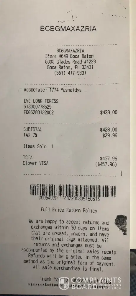 On March 9th 2020, I bought a dress in BCBG Boca Raton Store for a wedding which days later was cancelled due the pandemic. Since that I contacted them to returned this item but the store were closed and still closed for good. After many calls and emails; finally I got a response asking me to return the item to them directly with the original receipt, which I did.