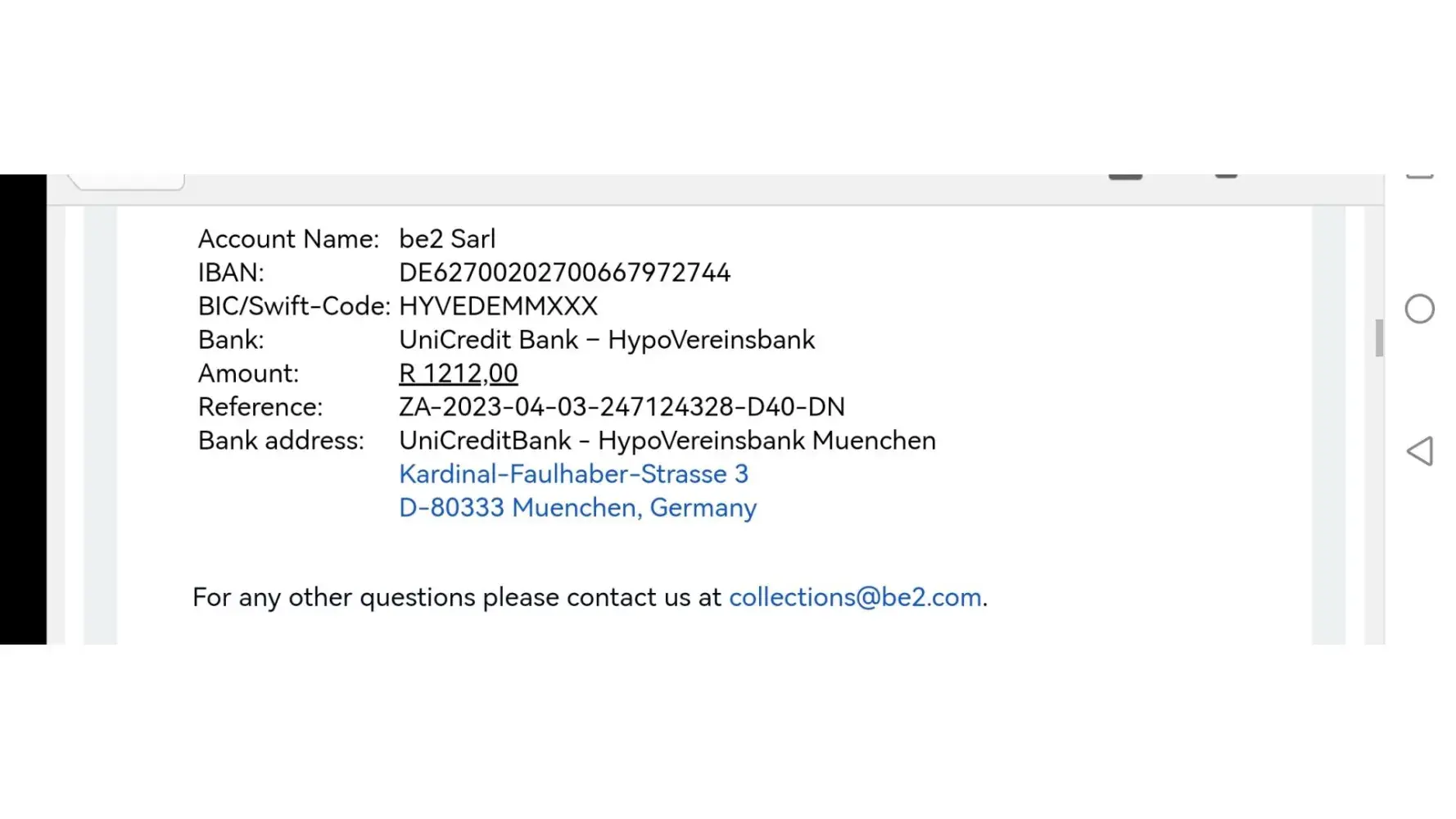 I signed up for a month trial with be2 in 2021. There was no given time frame for vancellation period or that there would be an overdue fee to pay. They then sent me a debt collection letter based in New Zealand which I paid, this is proven through my credit score company that it was paid. They then recently sent another letter from a debt collector from Germany claiming I still owe be2 the money. I have emailed them but have had nothing back from them except for we are no longer in charge of your account. They claim they never received the debt collection the first time which is false as I handled it with Nz recoveries first time around.